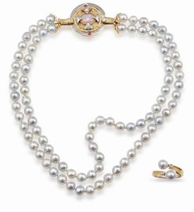 Demi-parure composta da una collana a due fili di perle con opale, diamanti e rubini [..]