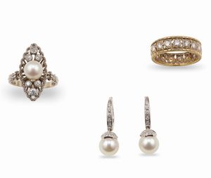 Lotto composto da due anelli ed un paio di orecchini con perle e diamanti