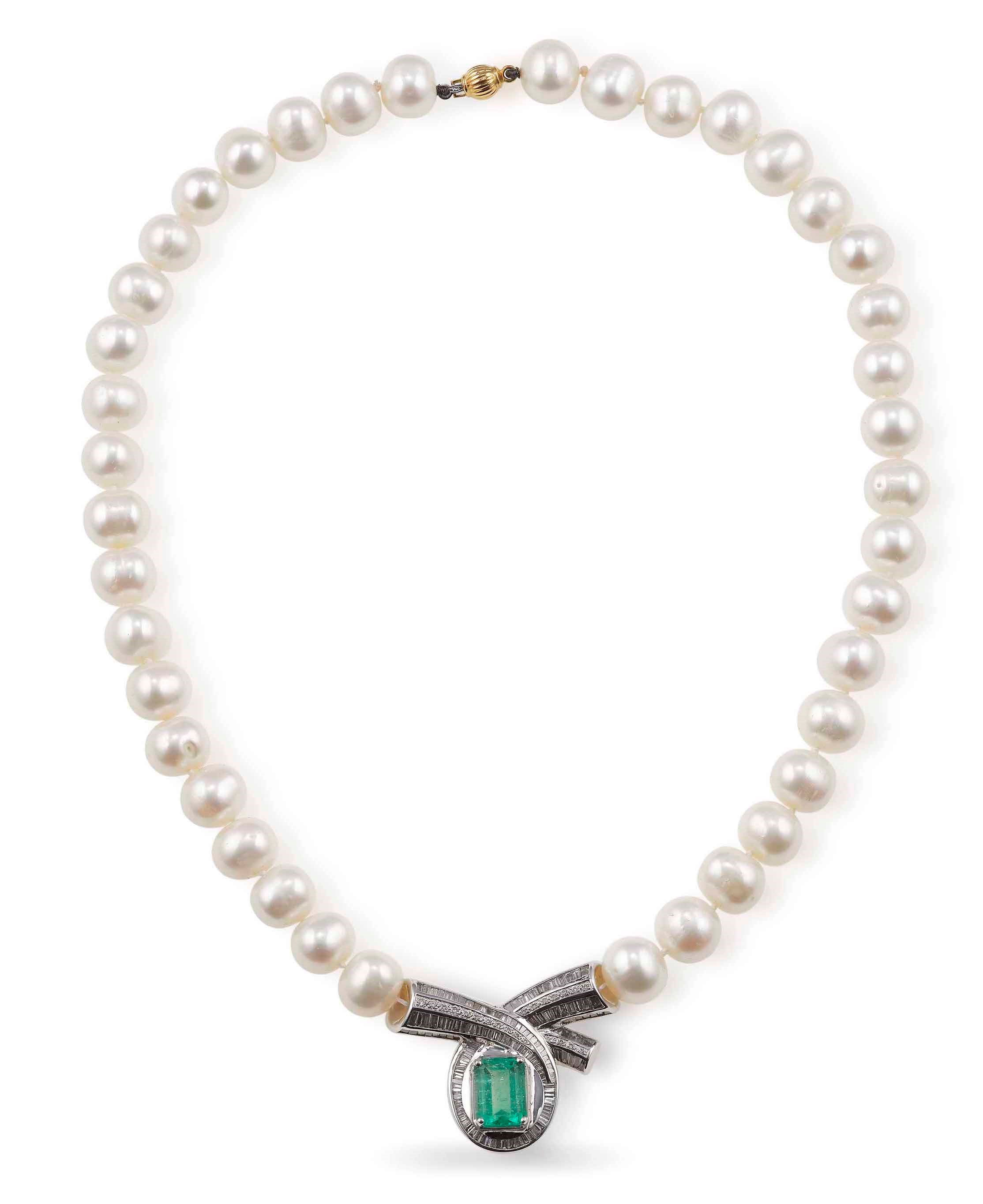 Girocollo con perle coltivate, smeraldo Colombia di ct 3.50 circa e diamanti