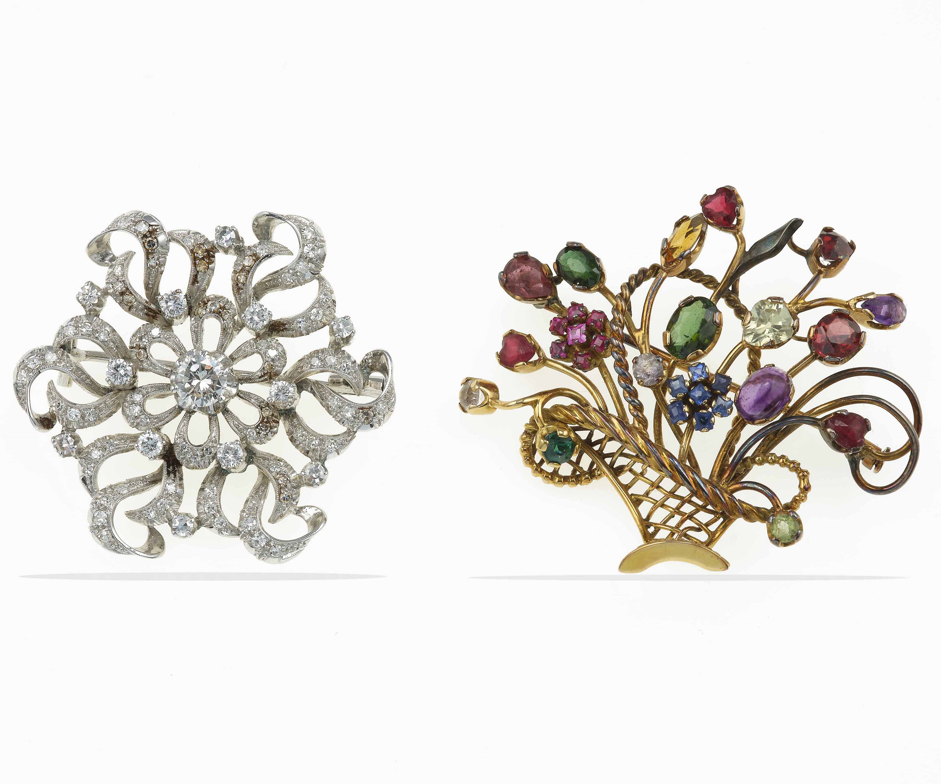 Lotto composto da due spille, una con diamanti ed una con gem-set