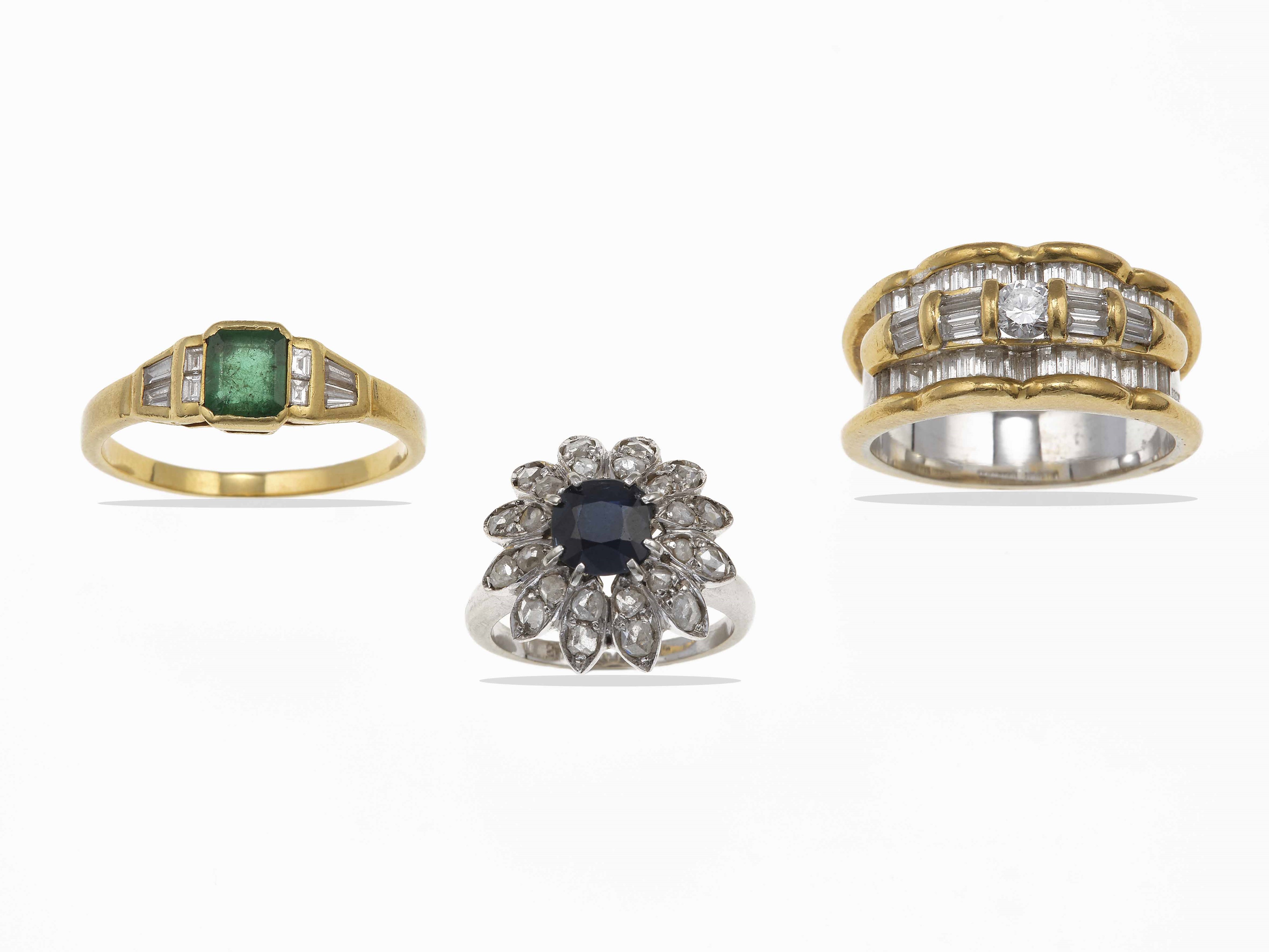 Lotto composto da tre anelli con diamanti, zaffiro e smeraldo