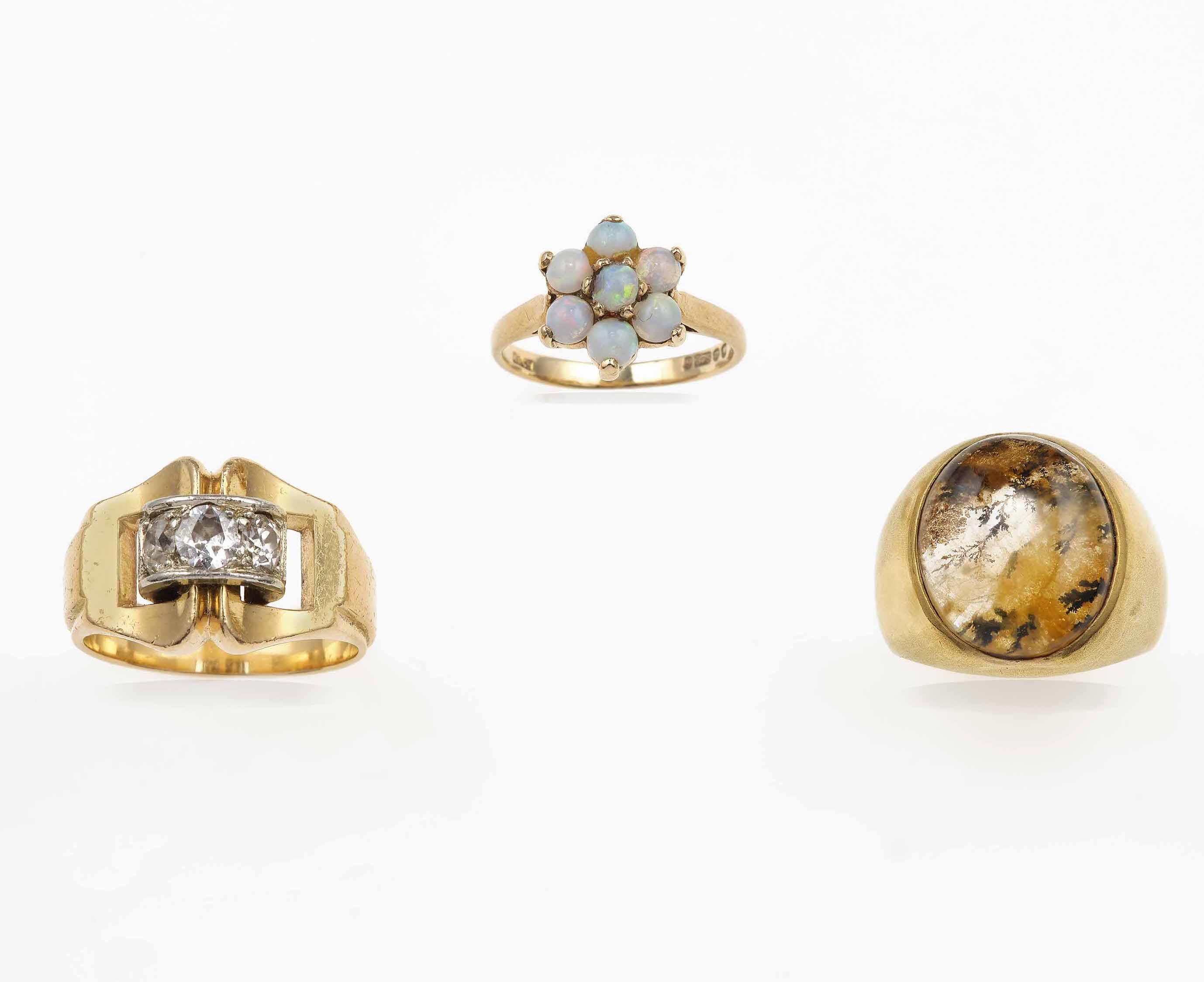 Lotto composto da tre anelli con opali, diamanti e agata muschiata