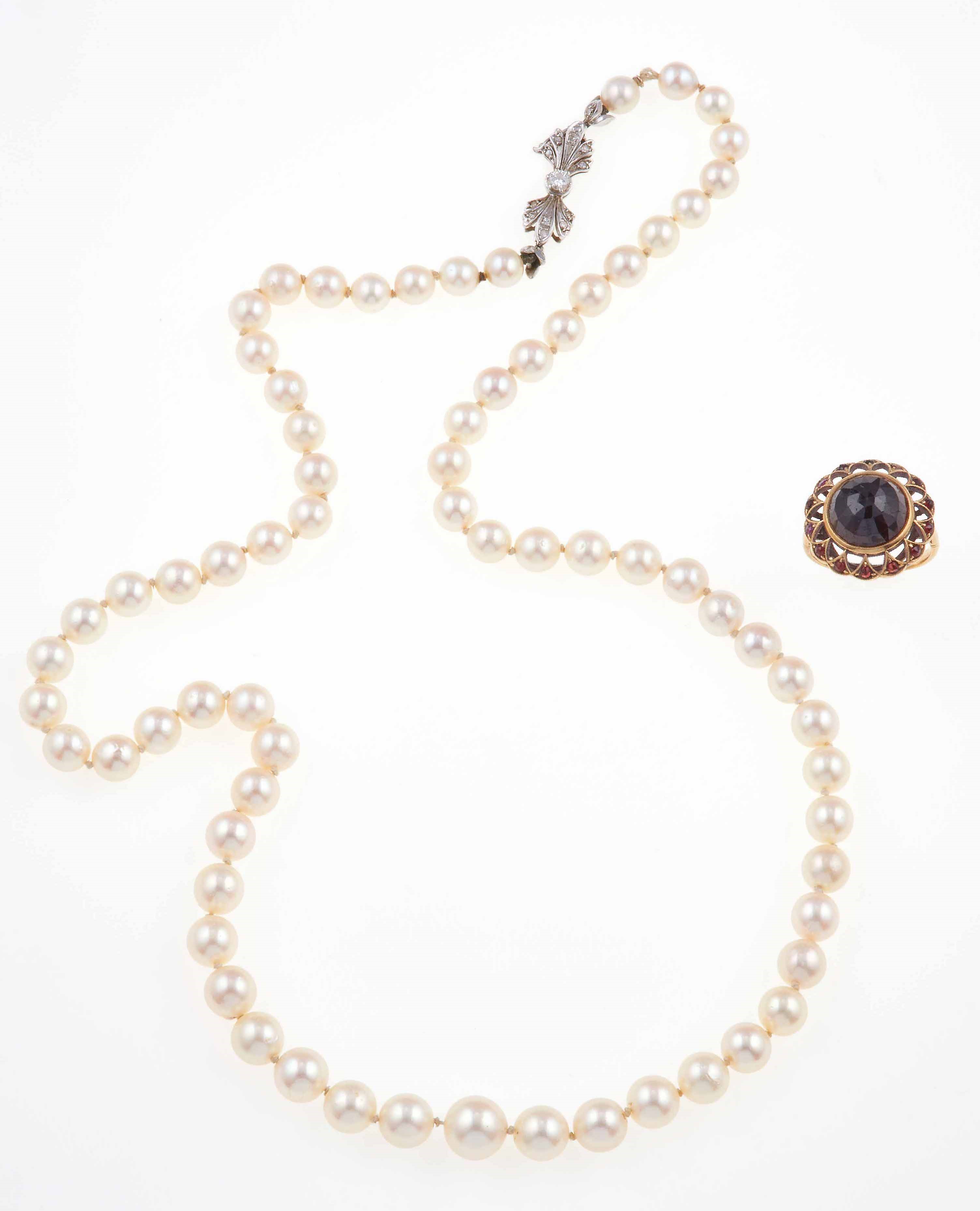Lotto composto da una collana di perle coltivate ed un anello con granato