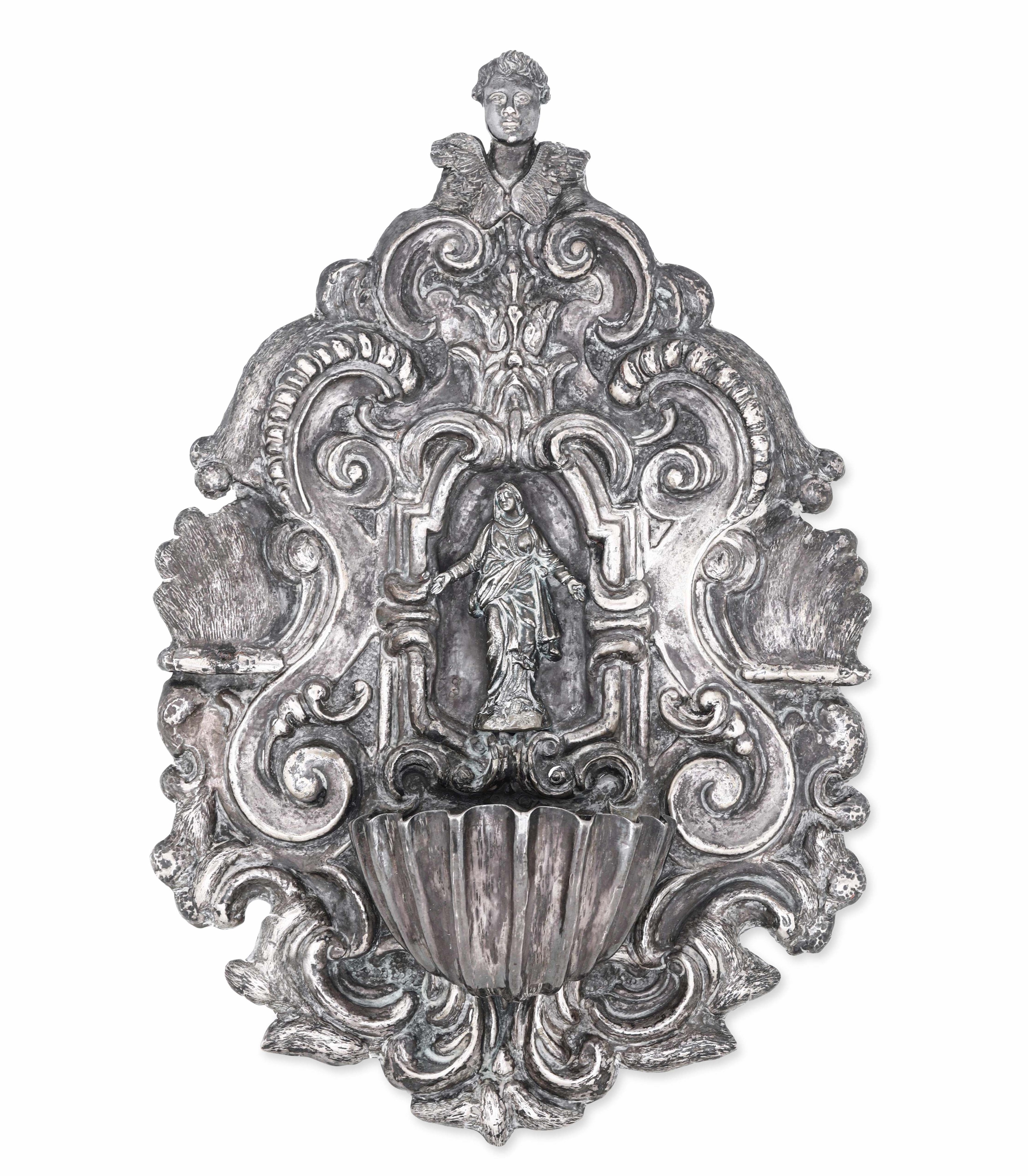 Acquasantiera in argento fuso, sbalzato e cesellato. Napoli XVII-XVIII secolo. Bolli [..]