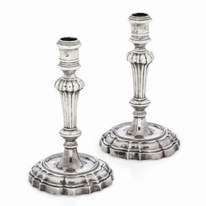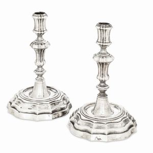 Coppia di candelieri. Argento fuso e sagomato. Venezia XVIII secolo, marchio dell’argentiere [..]
