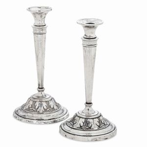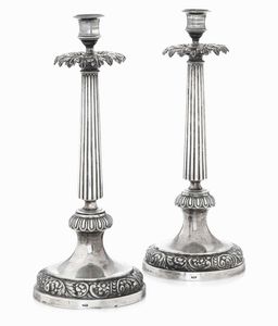Coppia di candelieri in argento fuso, sbalzato e cesellato, maestro argentiere Angelo [..]