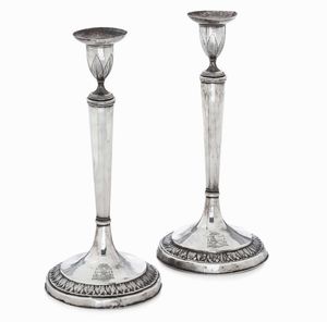 Coppia di candelieri. Argento fuso, sbalzato e cesellato. Ferrara 1760/1770 circa. [..]
