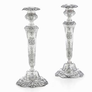 Coppia di candelieri. Argento 925 fuso, sagomato, traforato e cesellato. Gorham, [..]