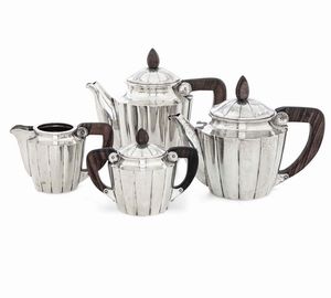 Servizio da tè e caffè. Argento fuso, sbalzato e legno sagomato. Argenteria artistica [..]