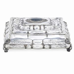 Scrigno portagioie. Argento fuso, sagomato e cesellato. Sul coperchio castone contenente [..]