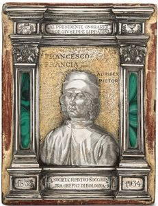 Targa commemorativa. Argento fuso, sbalzato e cesellato. Malachite su tavola in [..]