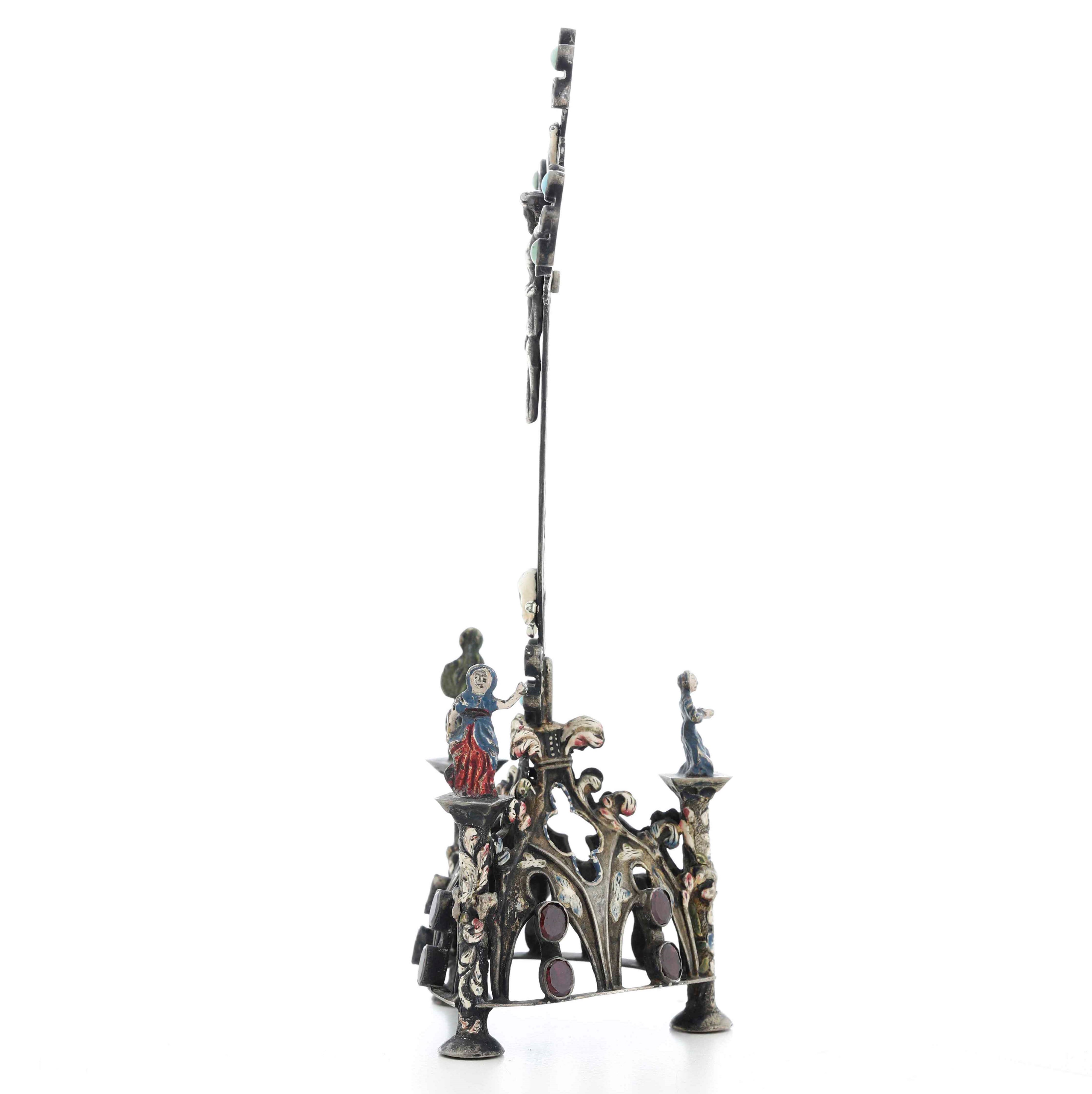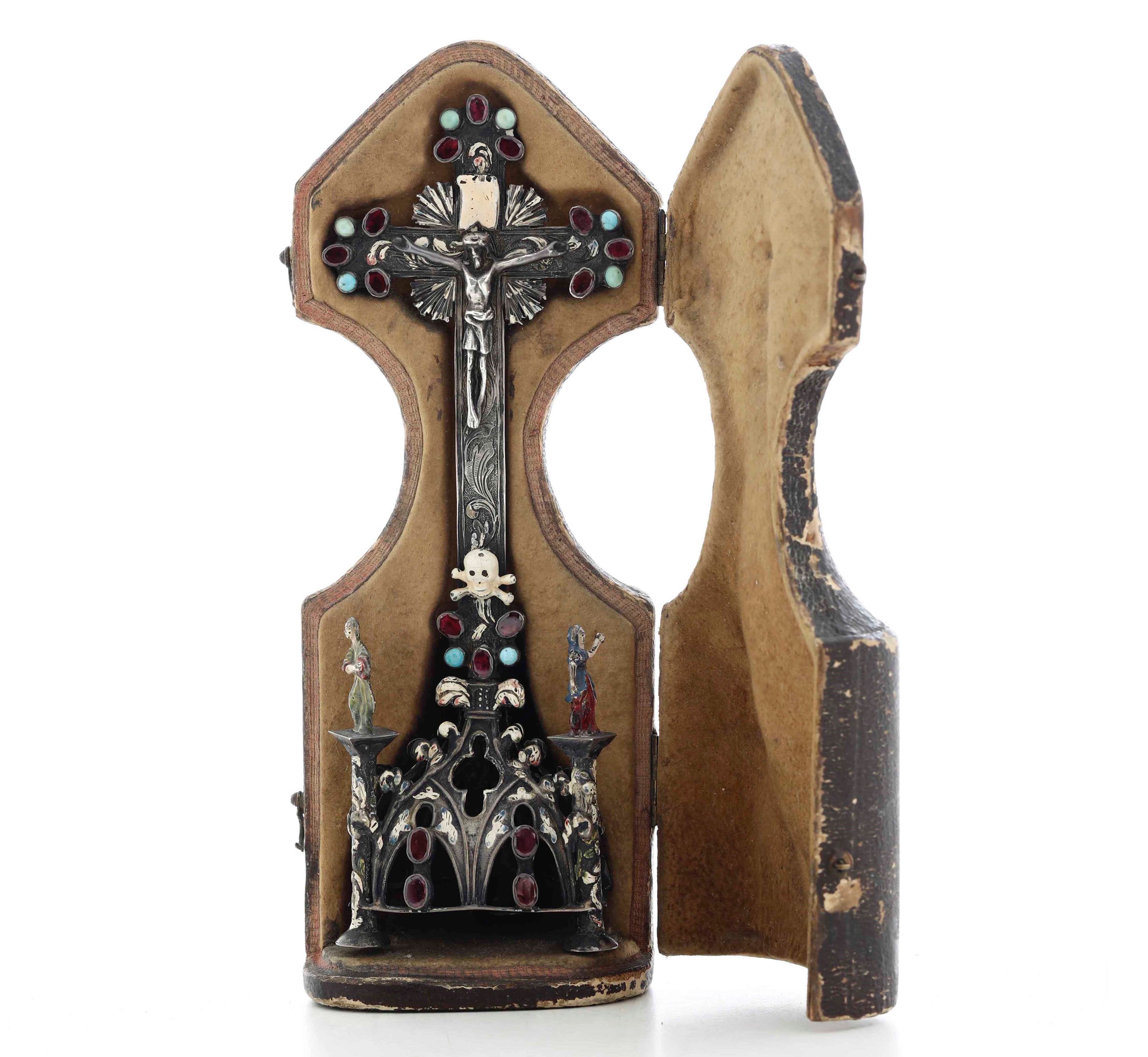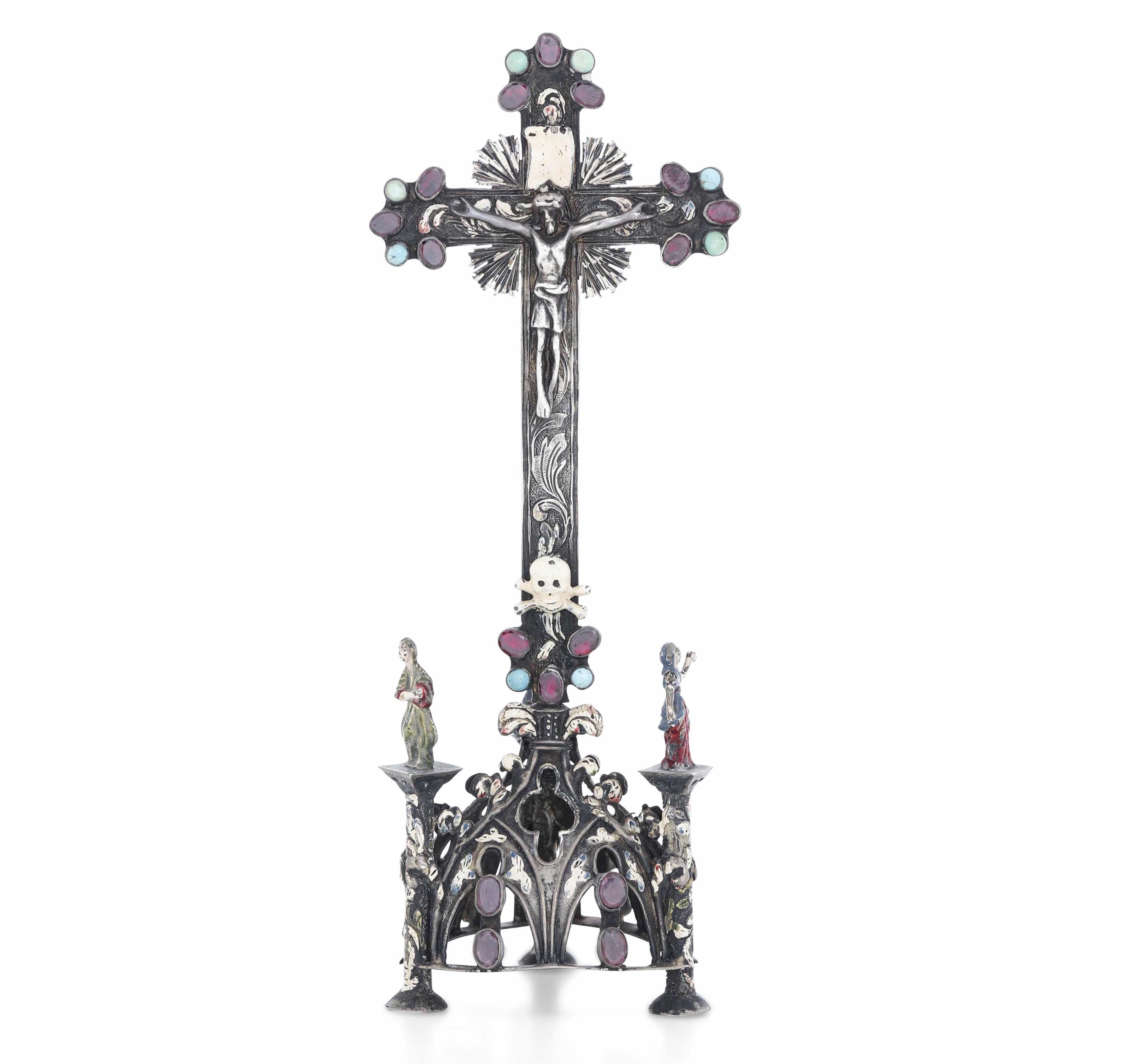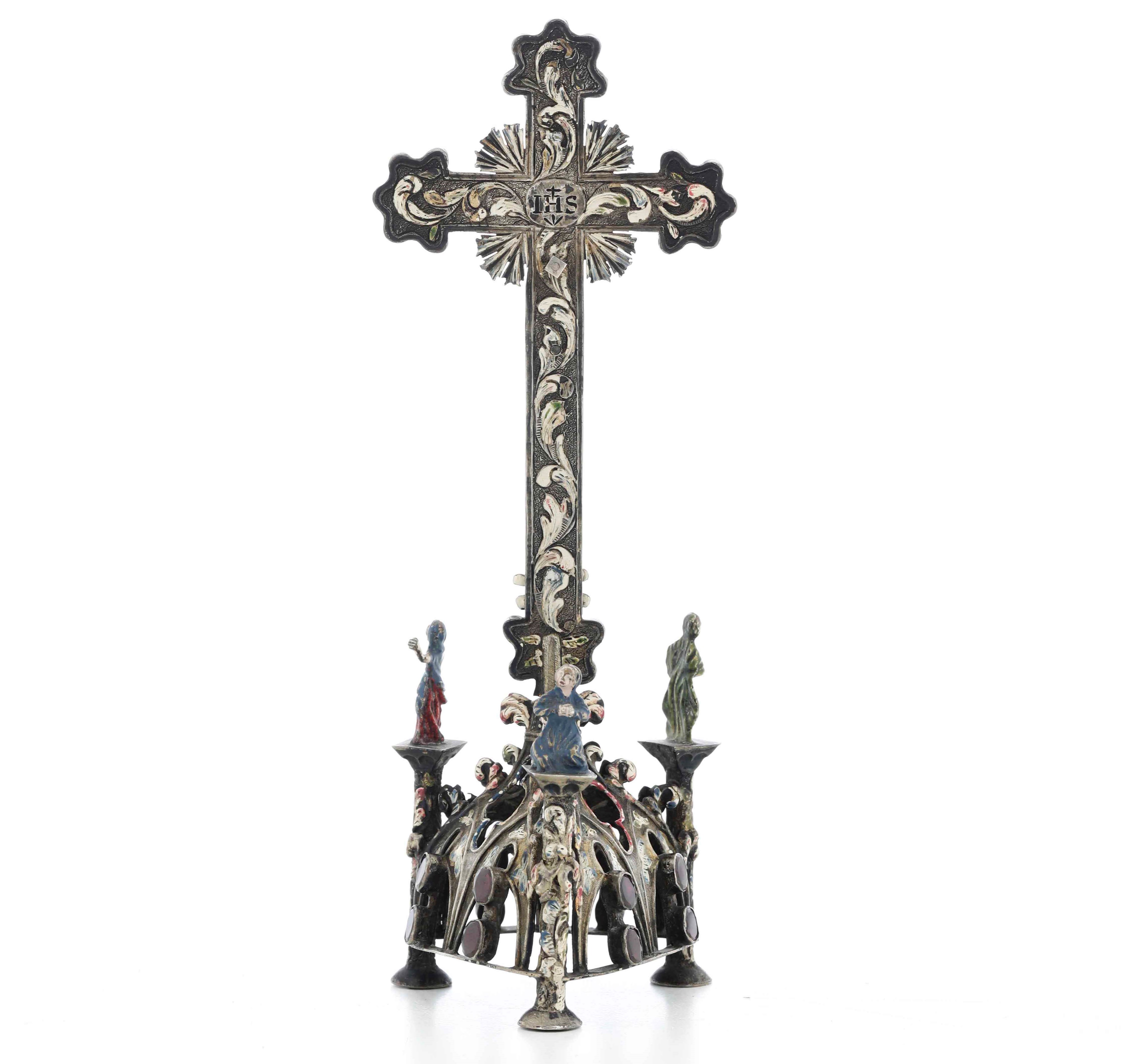 Crocifisso da meditazione. Argento fuso, traforato, cesellato e smaltato. Castoni [..]