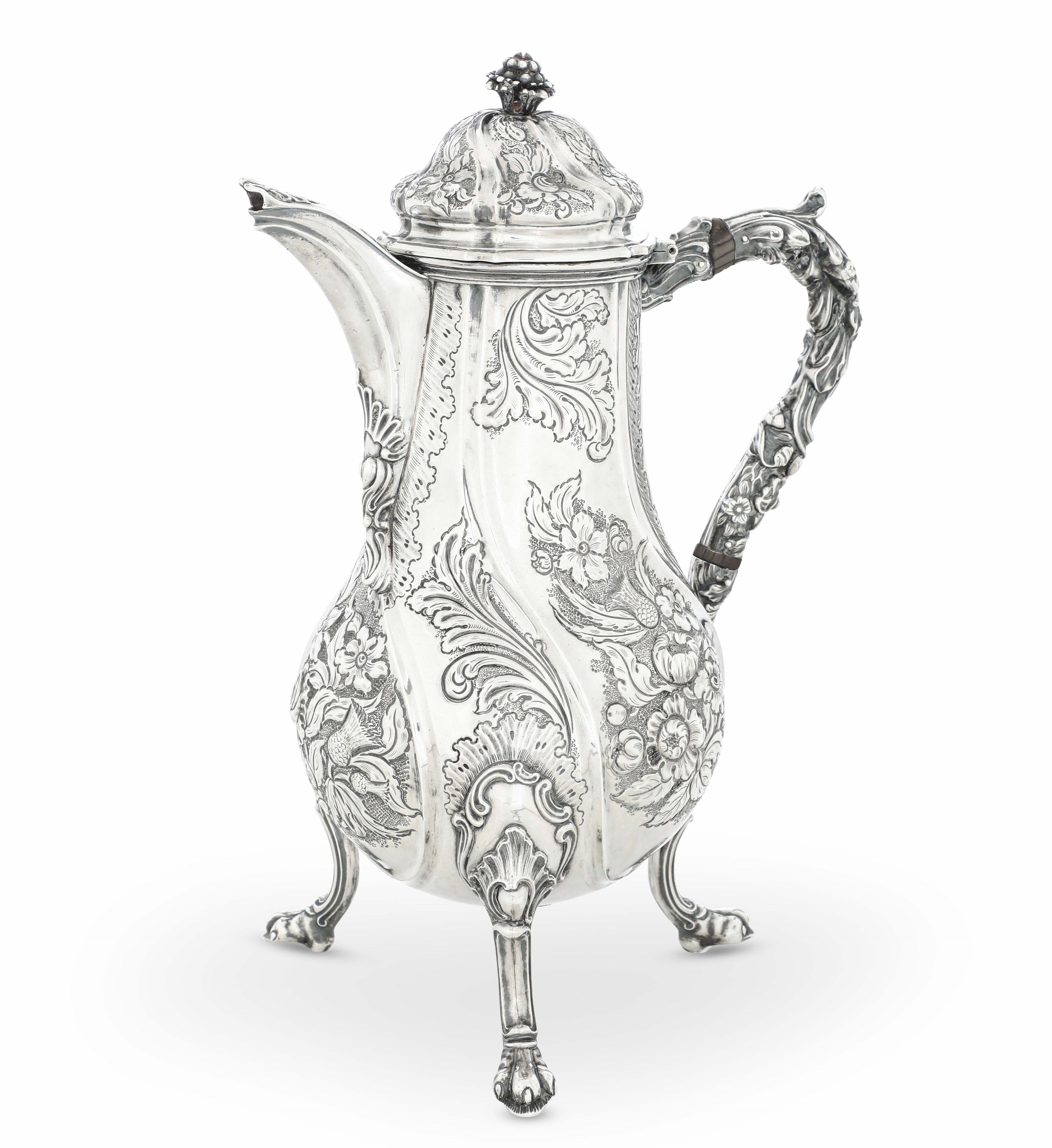 Grande caffettiera. Argento fuso, sbalzato e cesellato. Belgio, città di Namur, [..]