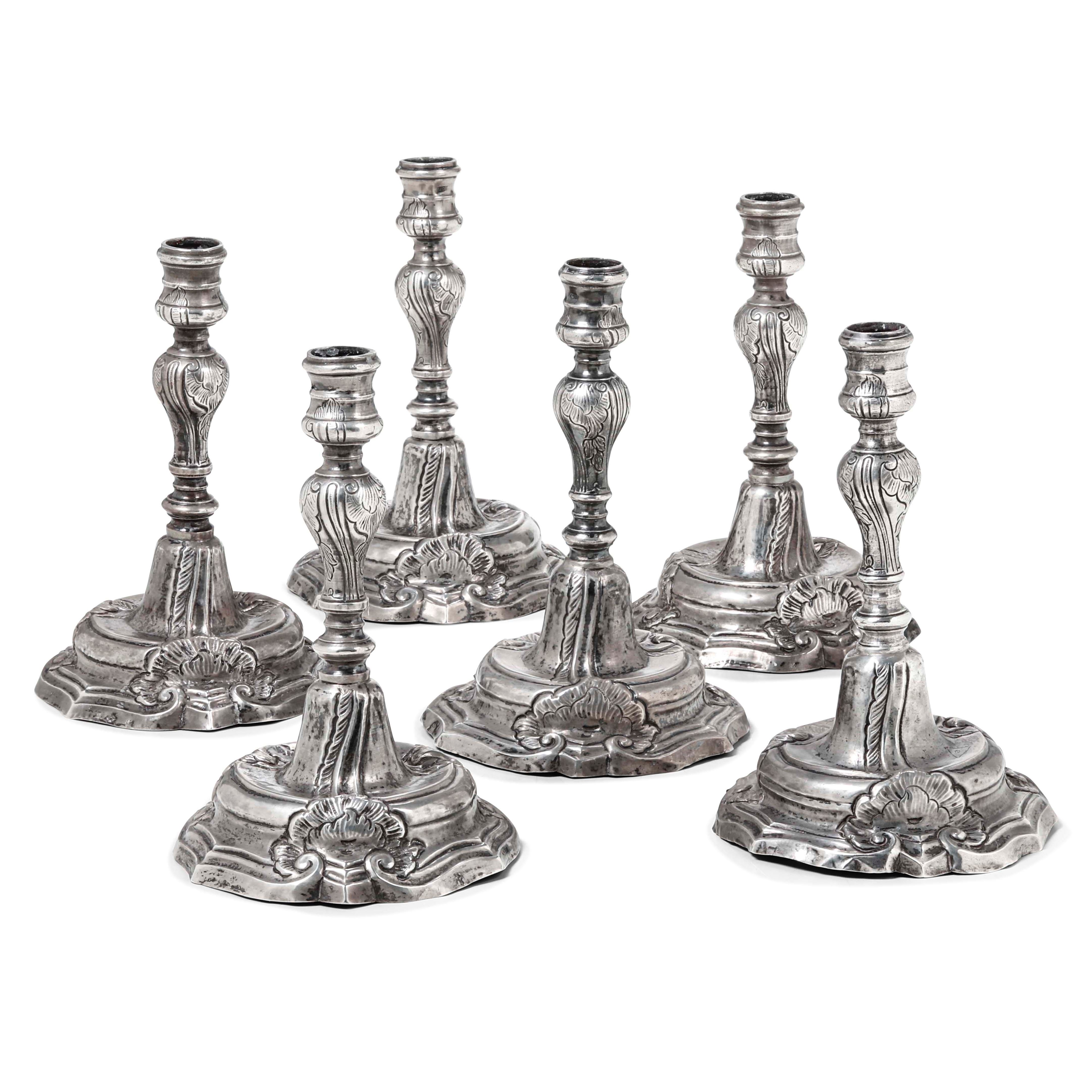 Gruppo di sei candelieri in argento fuso, sbalzato e cesellato. Palermo terzo quarto [..]