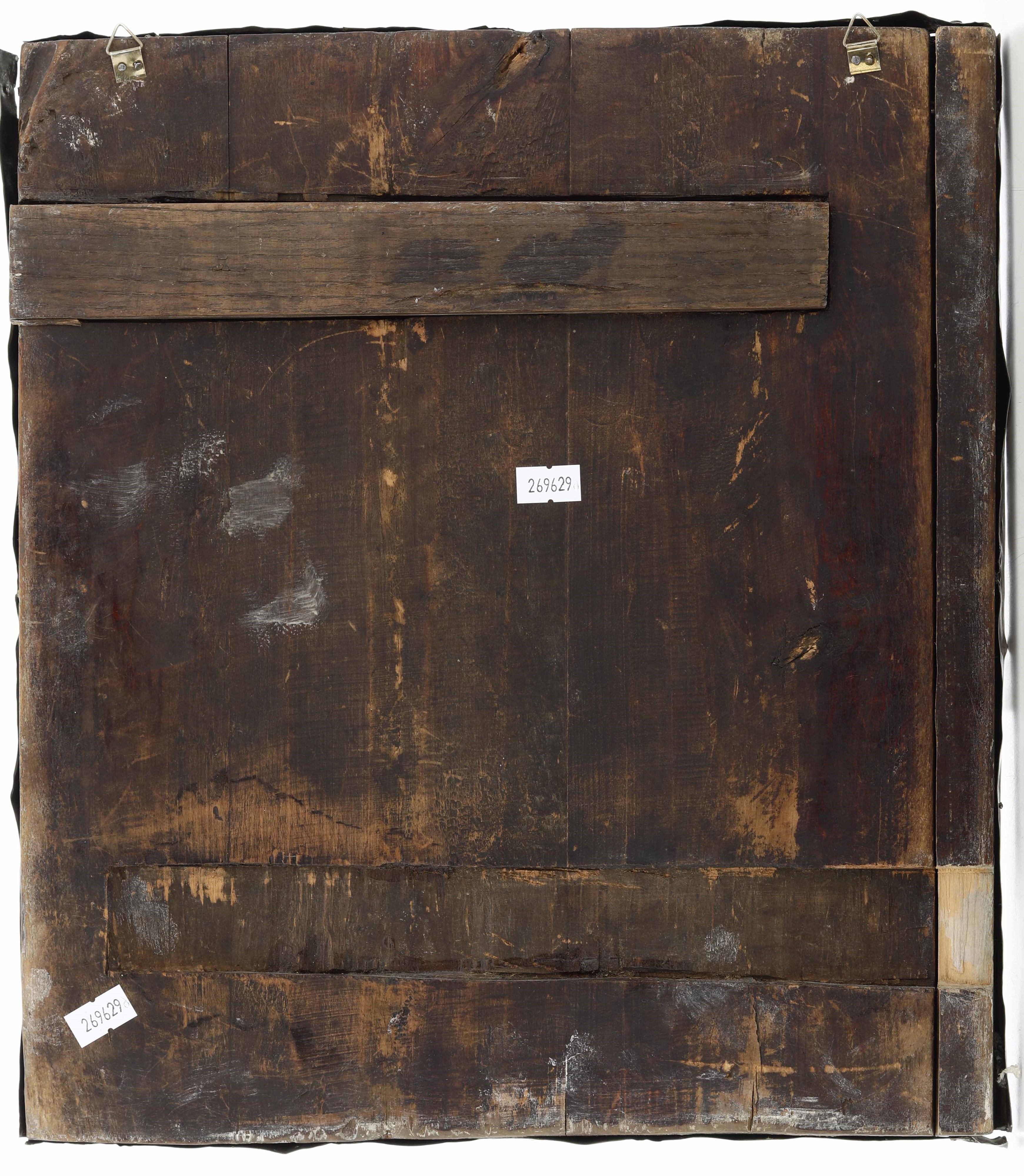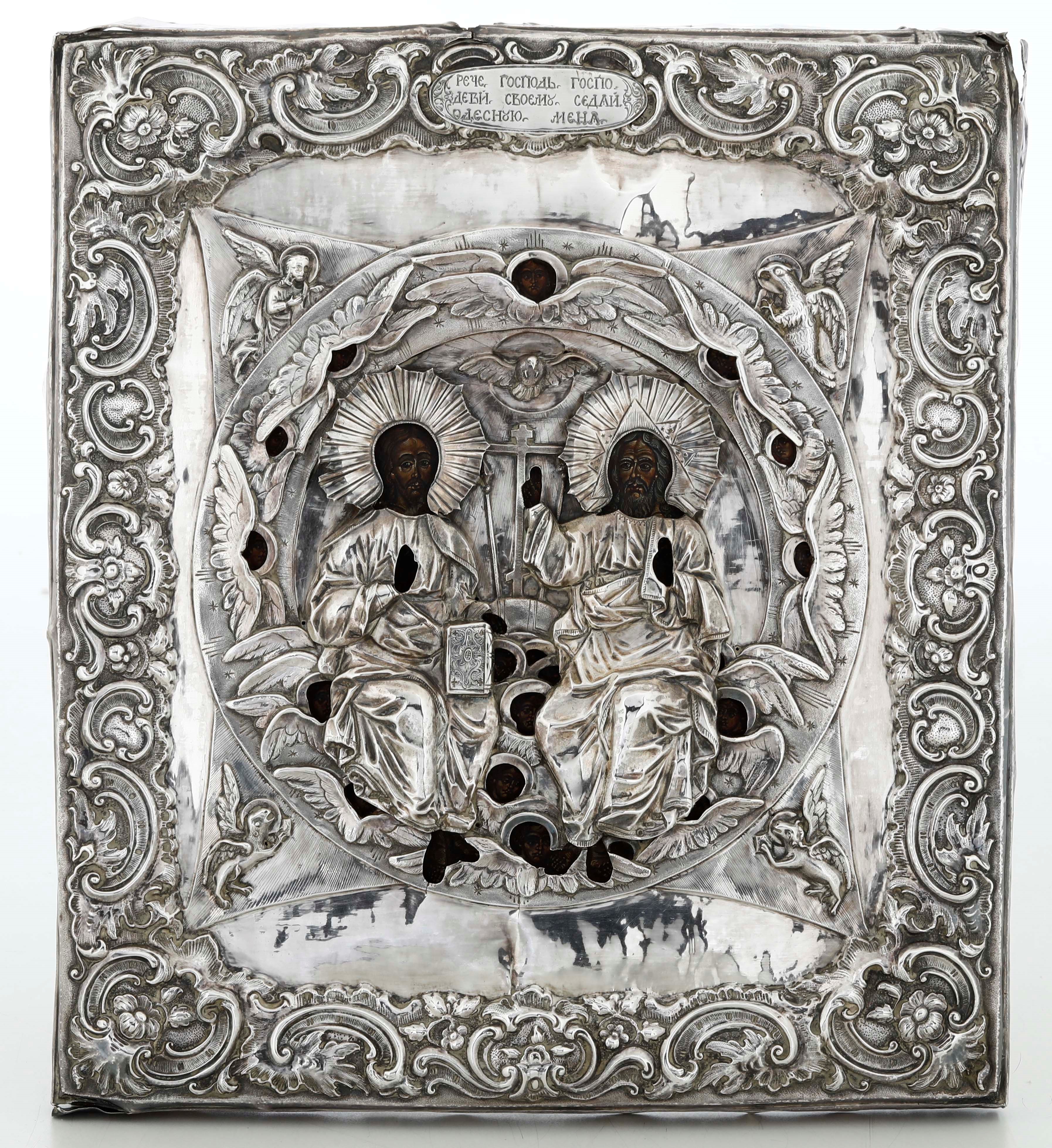 Icona raffigurante la Trinità a tempera su tavola. Riza in argento fuso, sbalzato [..]