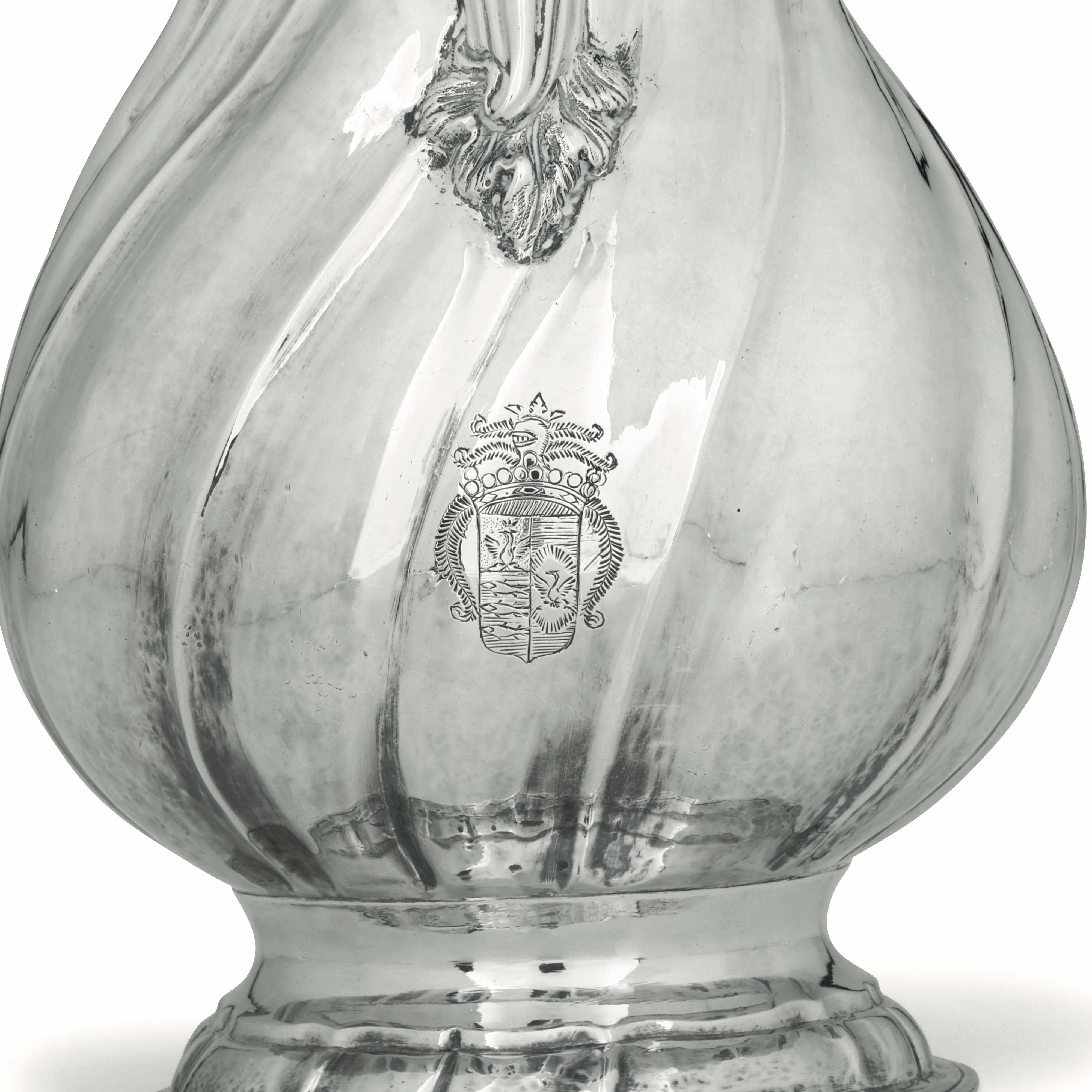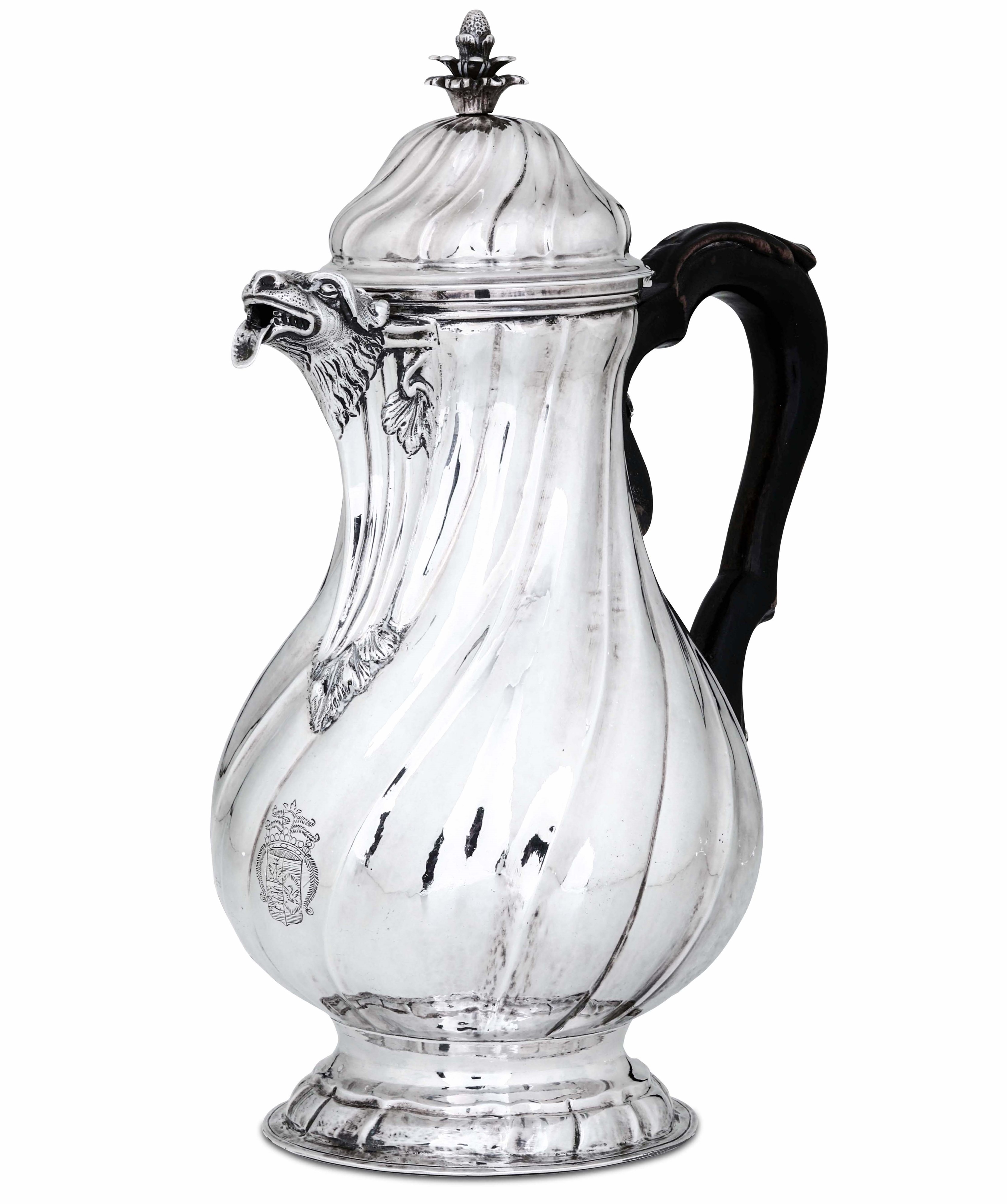 Importante caffettiera in argento fuso, sbalzato e cesellato. Manico in legno intagliato [..]
