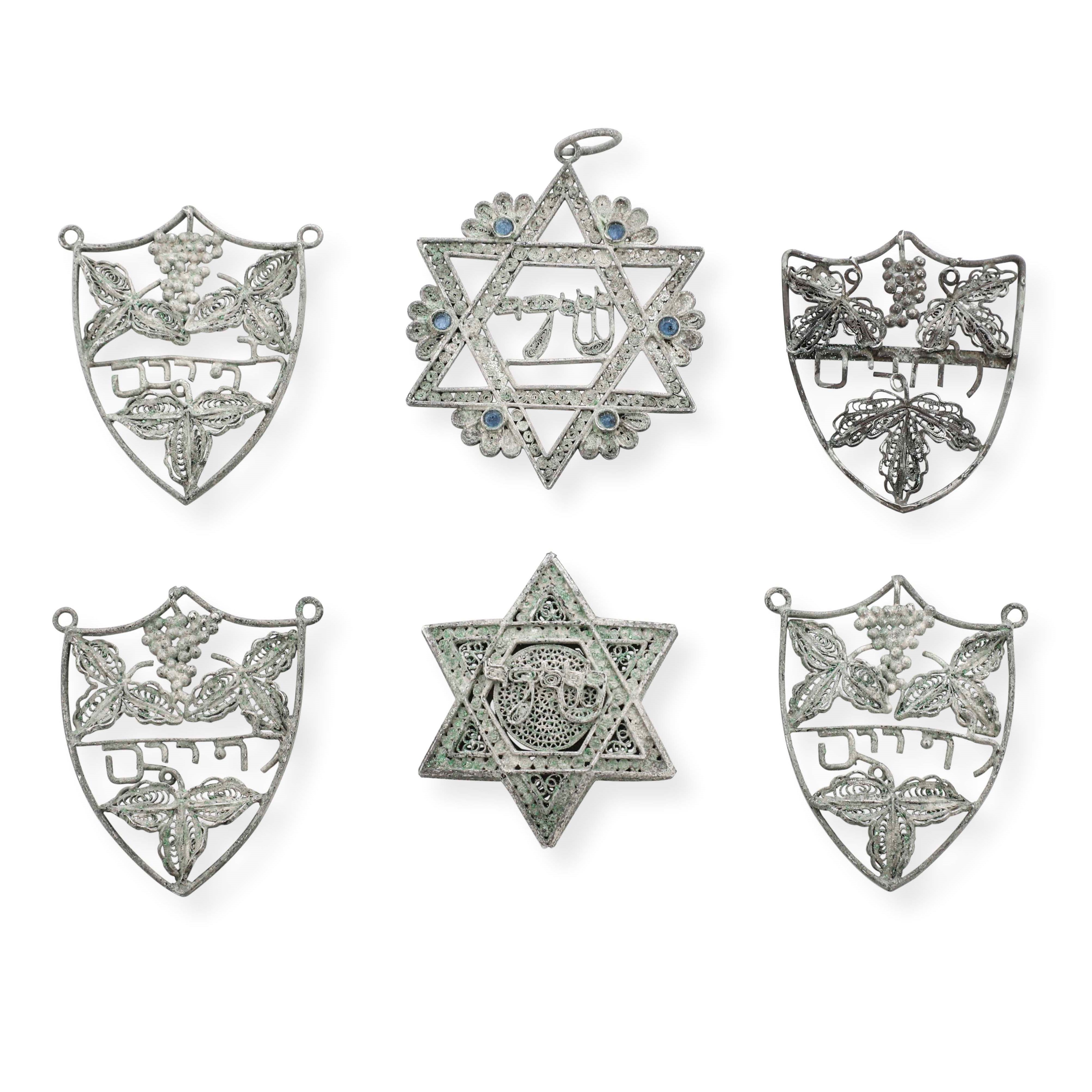 insieme di quattro decorazioni con lettere ebraiche e due stelle di Davide. Argento [..]
