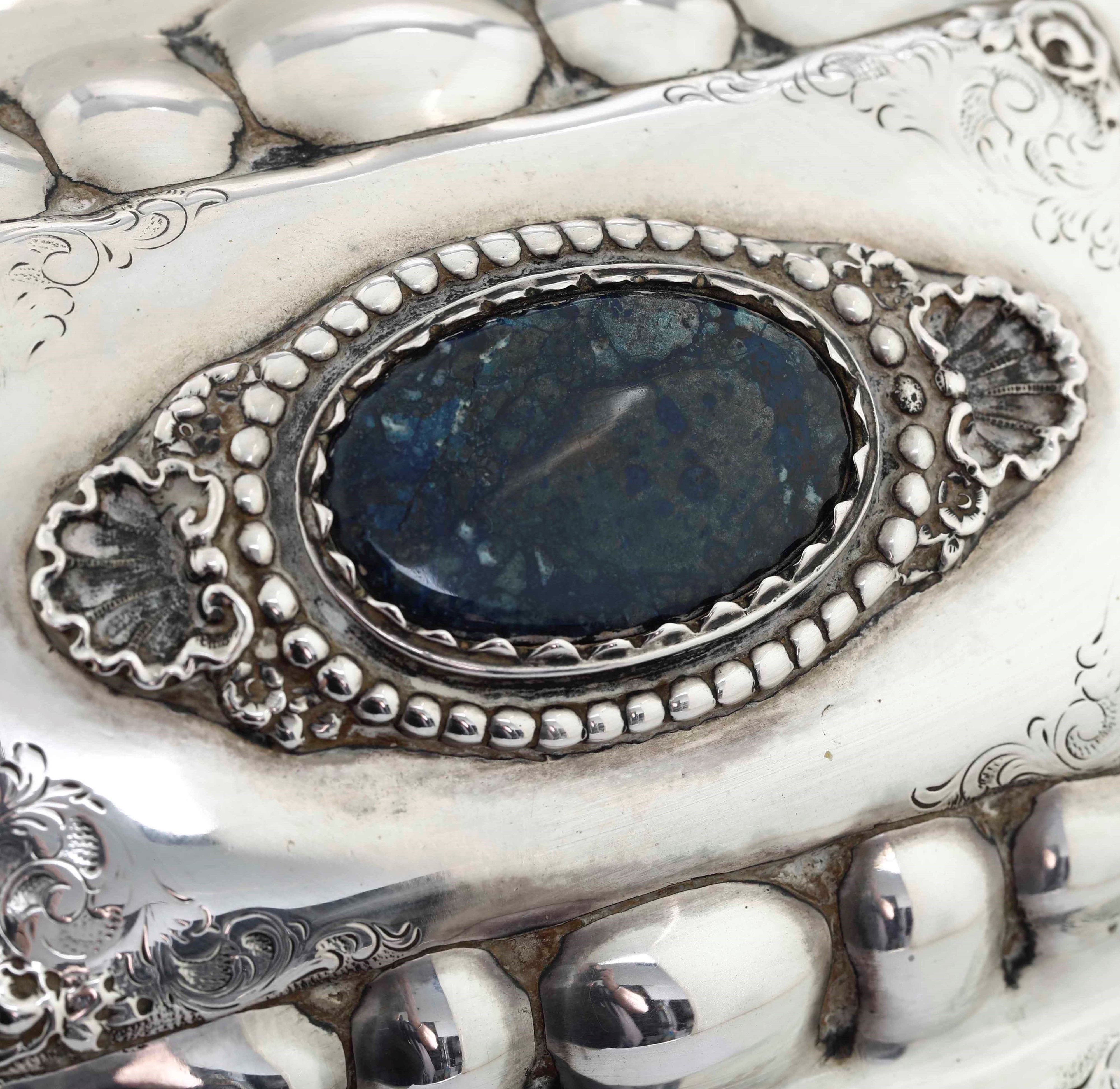 Portagioie. Argento fuso, sbalzato e inciso con coperchio centrato da pietra dura. [..]
