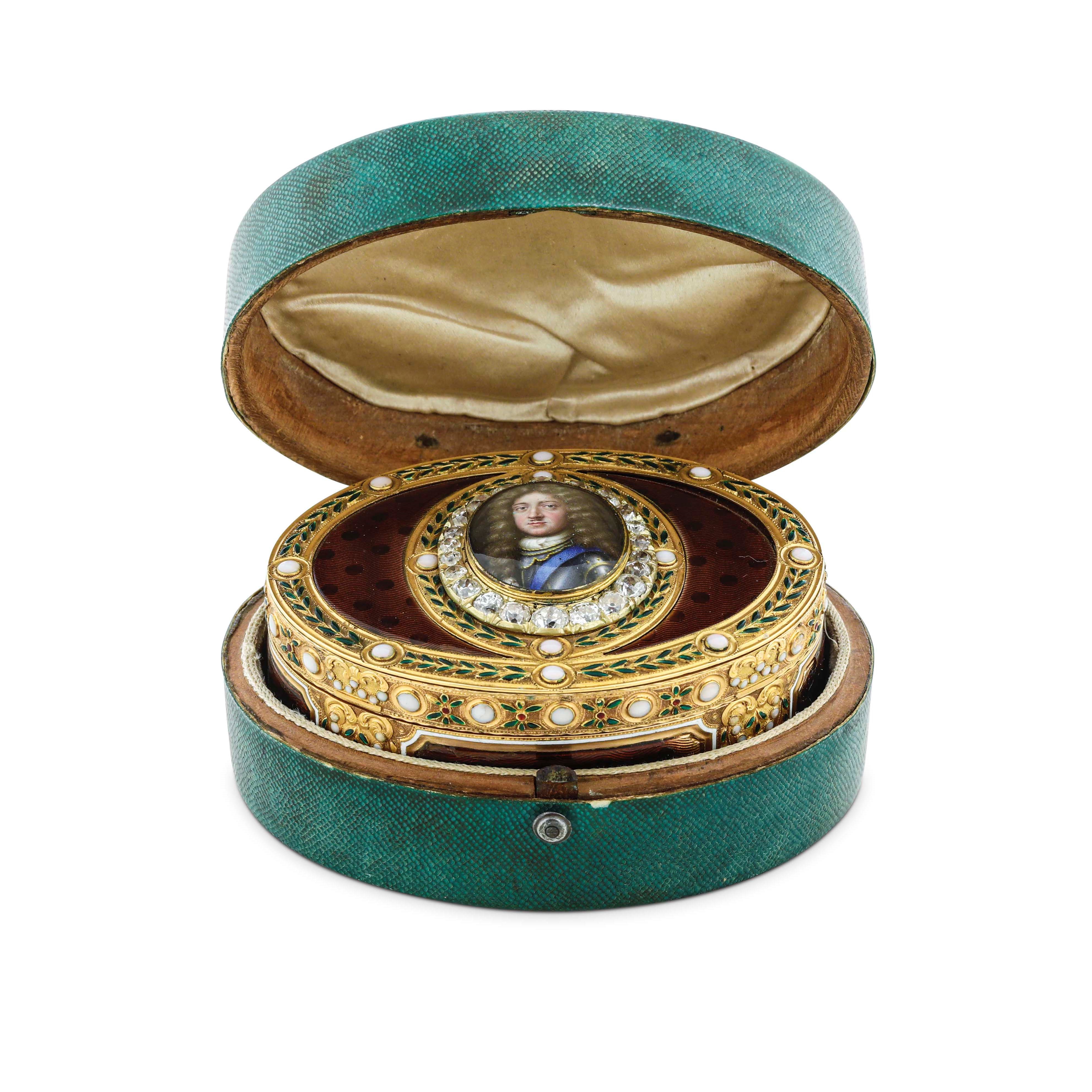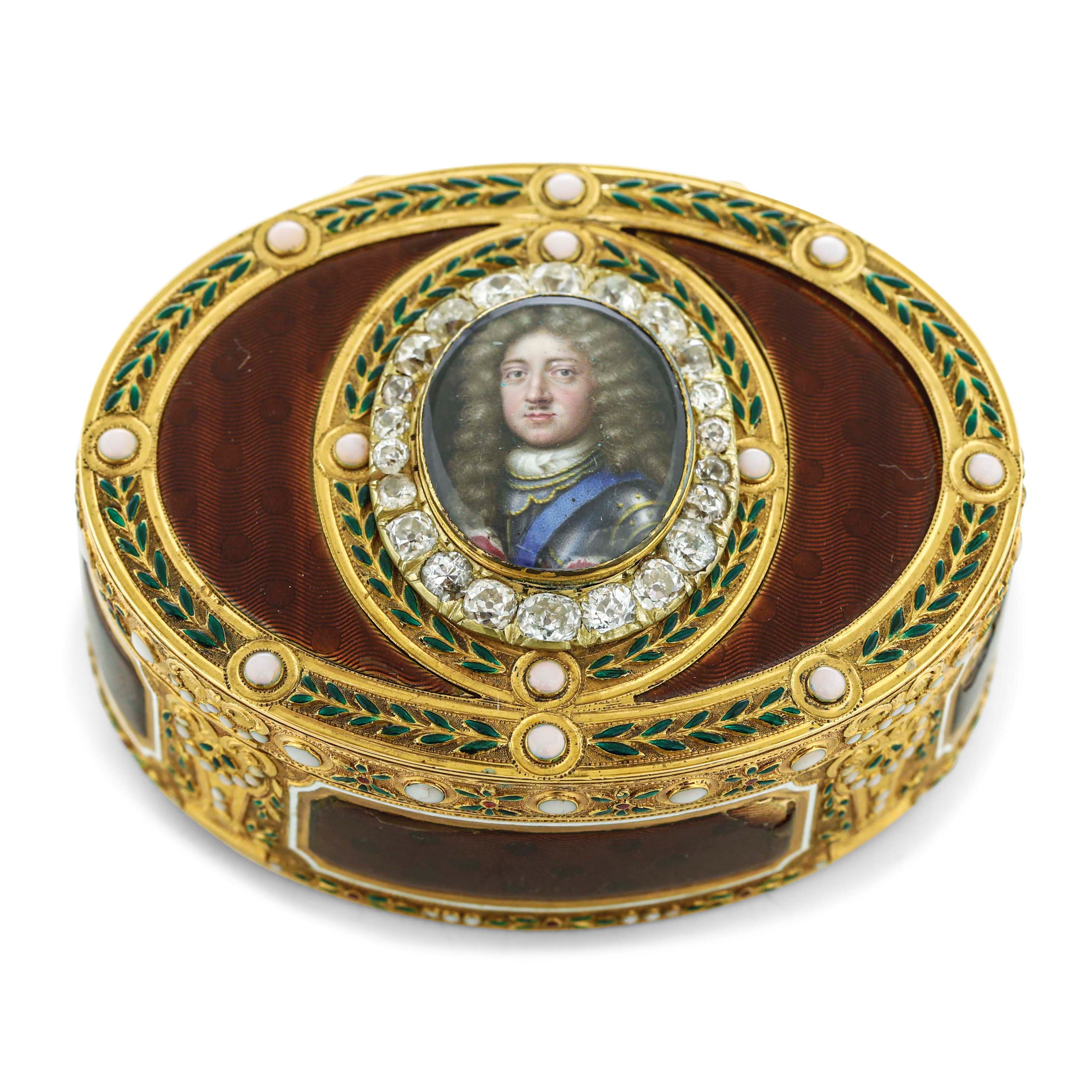 Tabacchiera. Oro 18kt e smalti, coperchio centrato da miniatura di Filippo II, Duca [..]