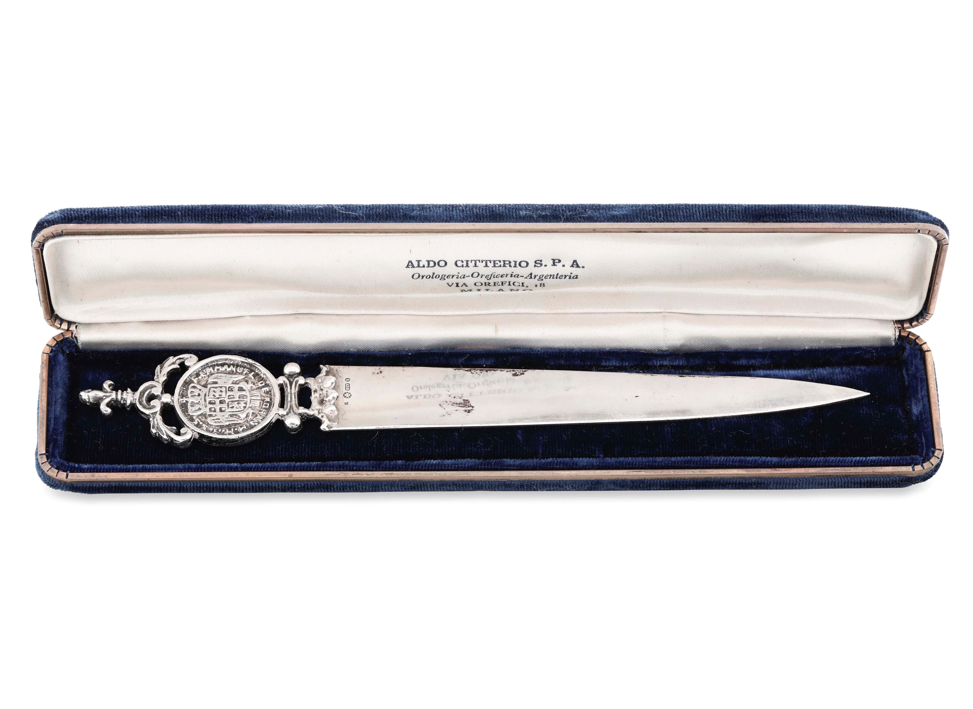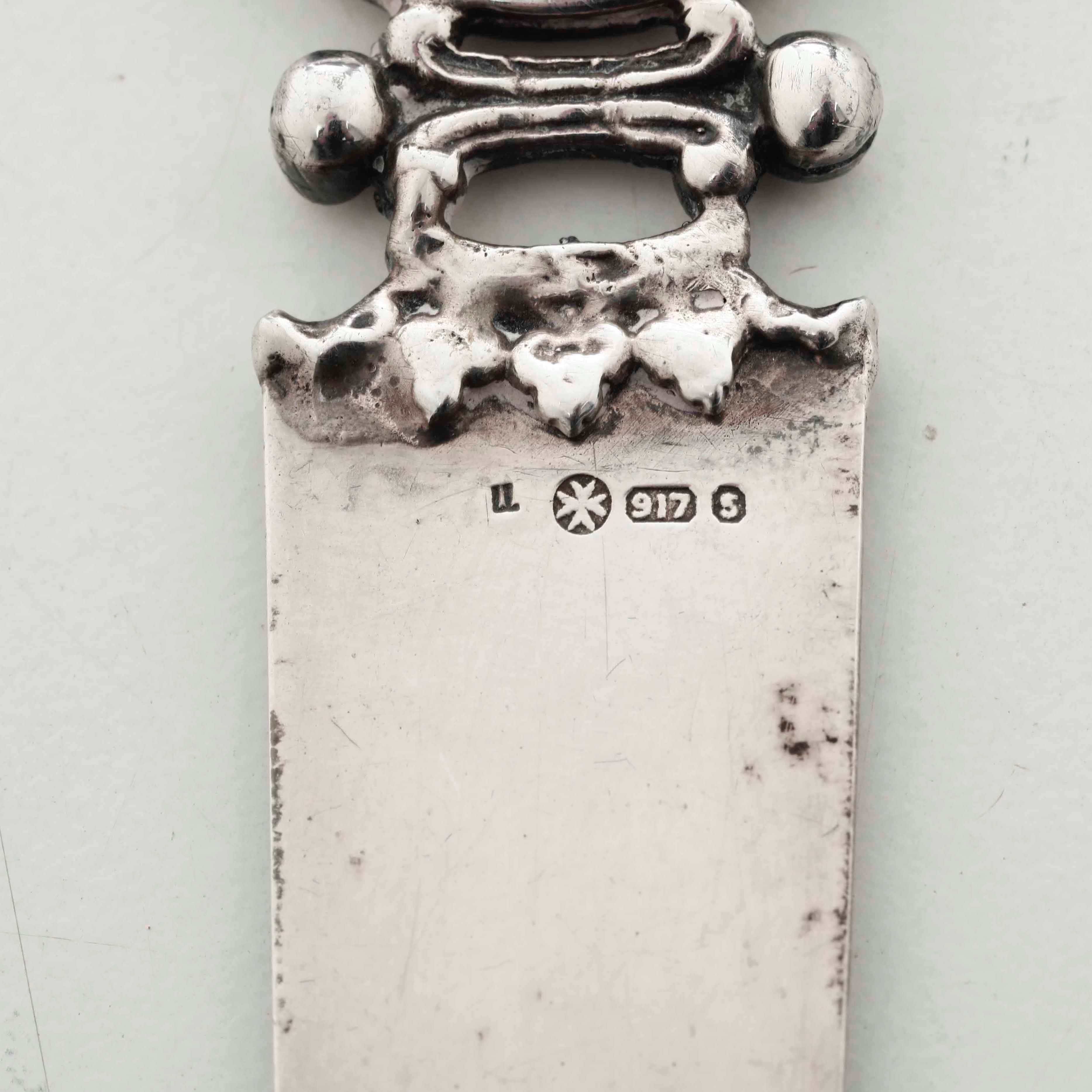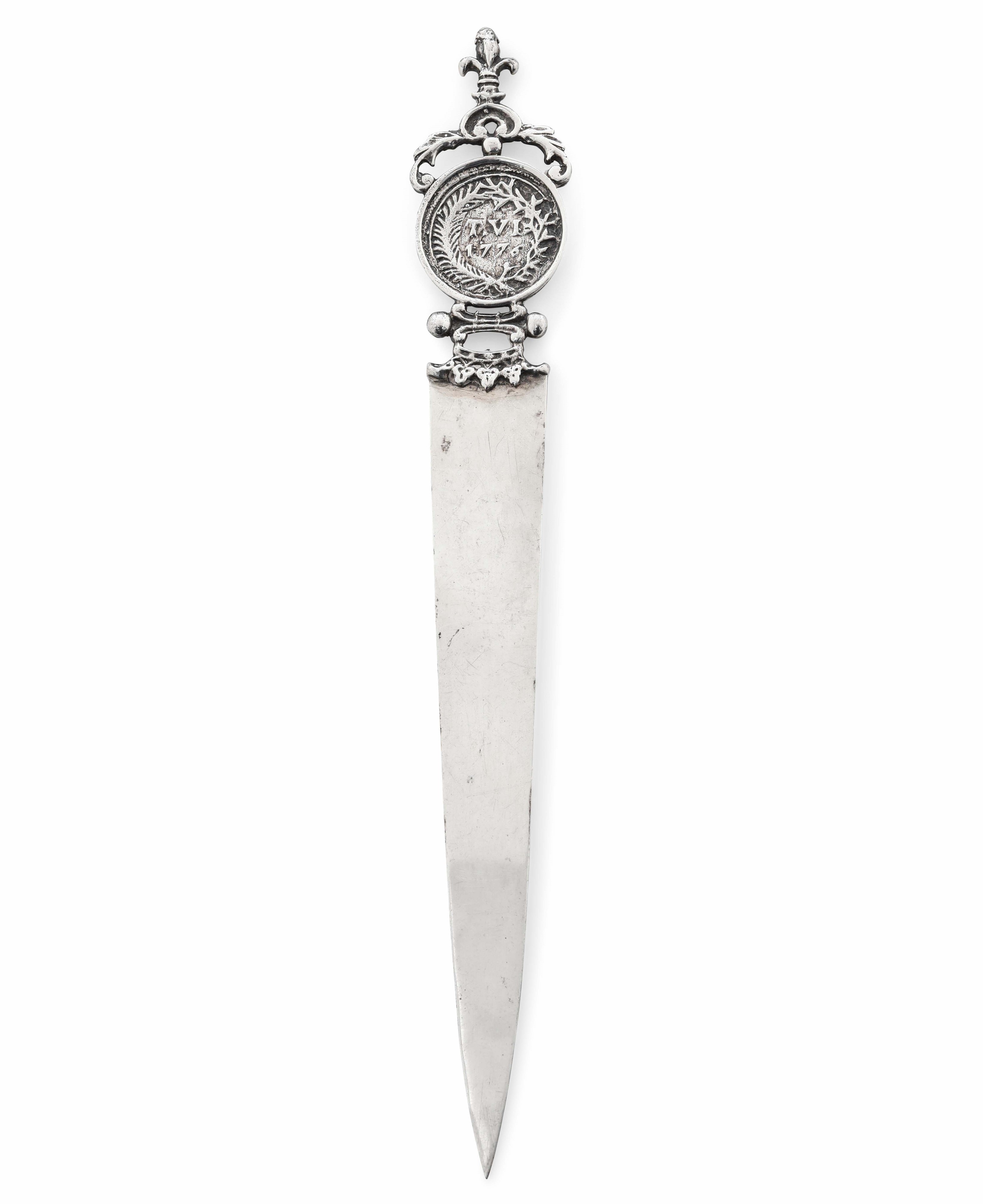 Tagliacarte. Argento fuso, traforato e cesellato. Marchio non identificato.