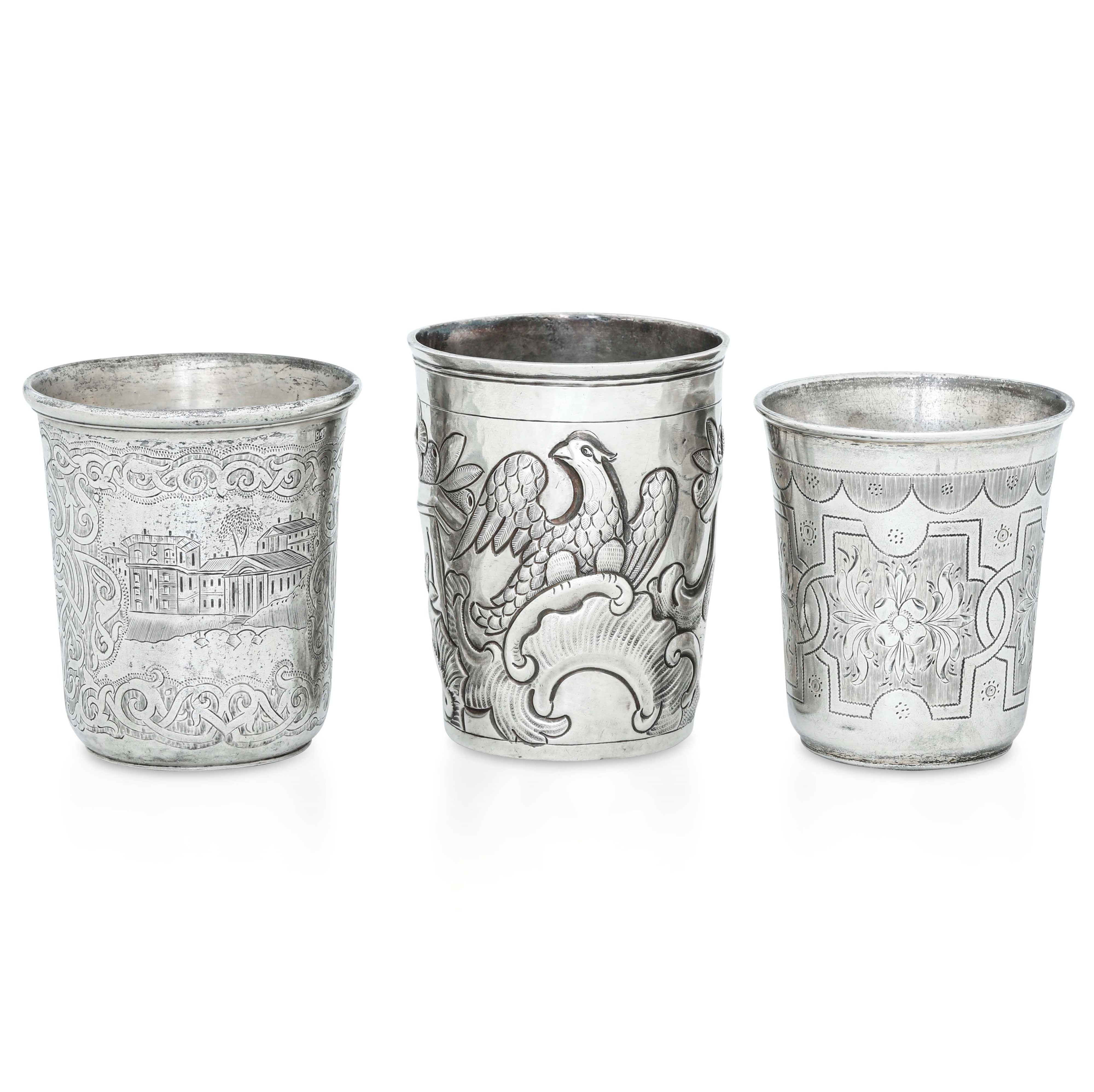 Tre bicchieri. Argento fuso, sbalzato e cesellato. Mosca XVIII-XIX secolo