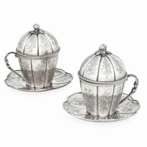 Coppia di tazze. Argento fuso, sbalzato e cesellato. Francia, marchio per l’esportazione [..]