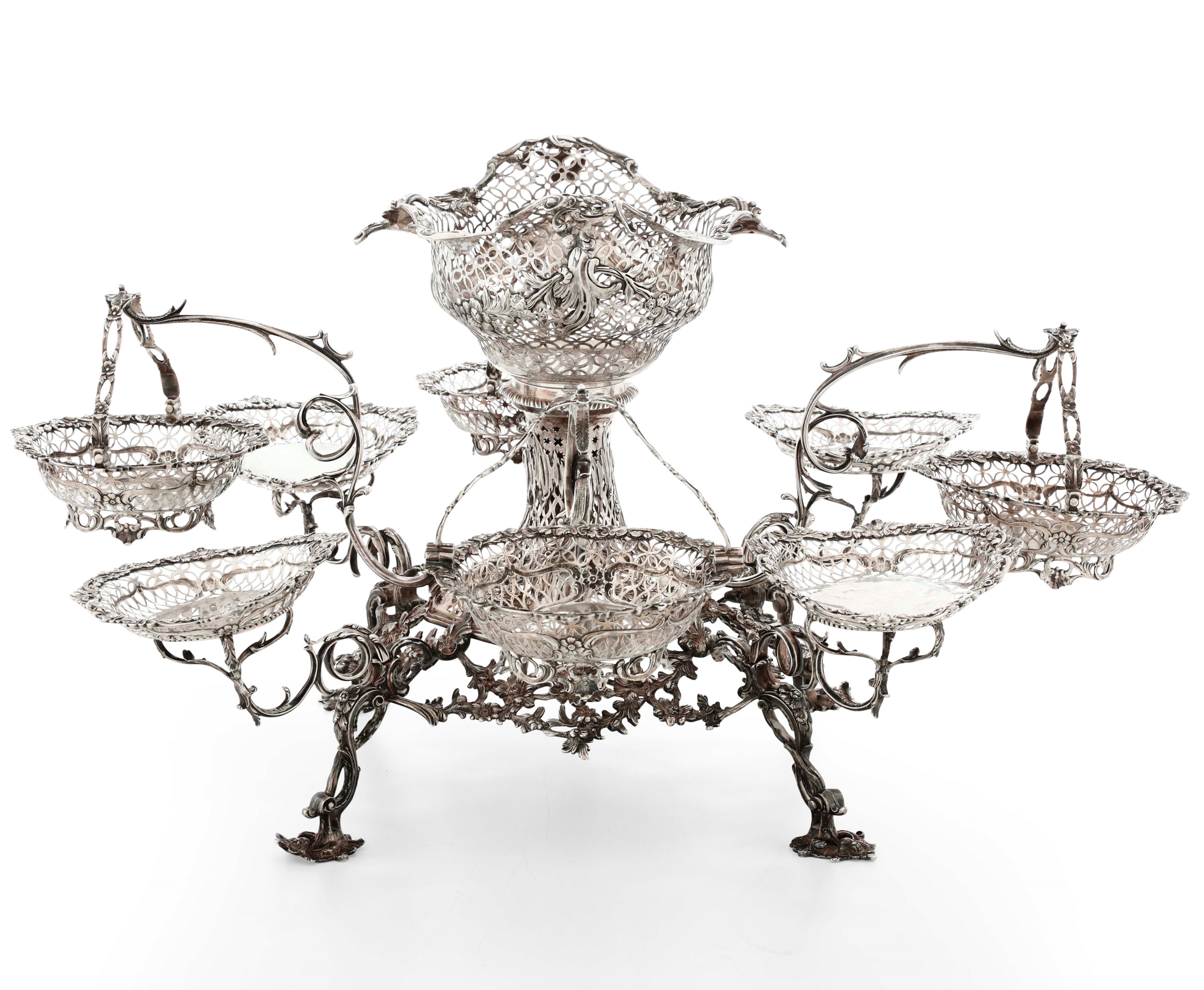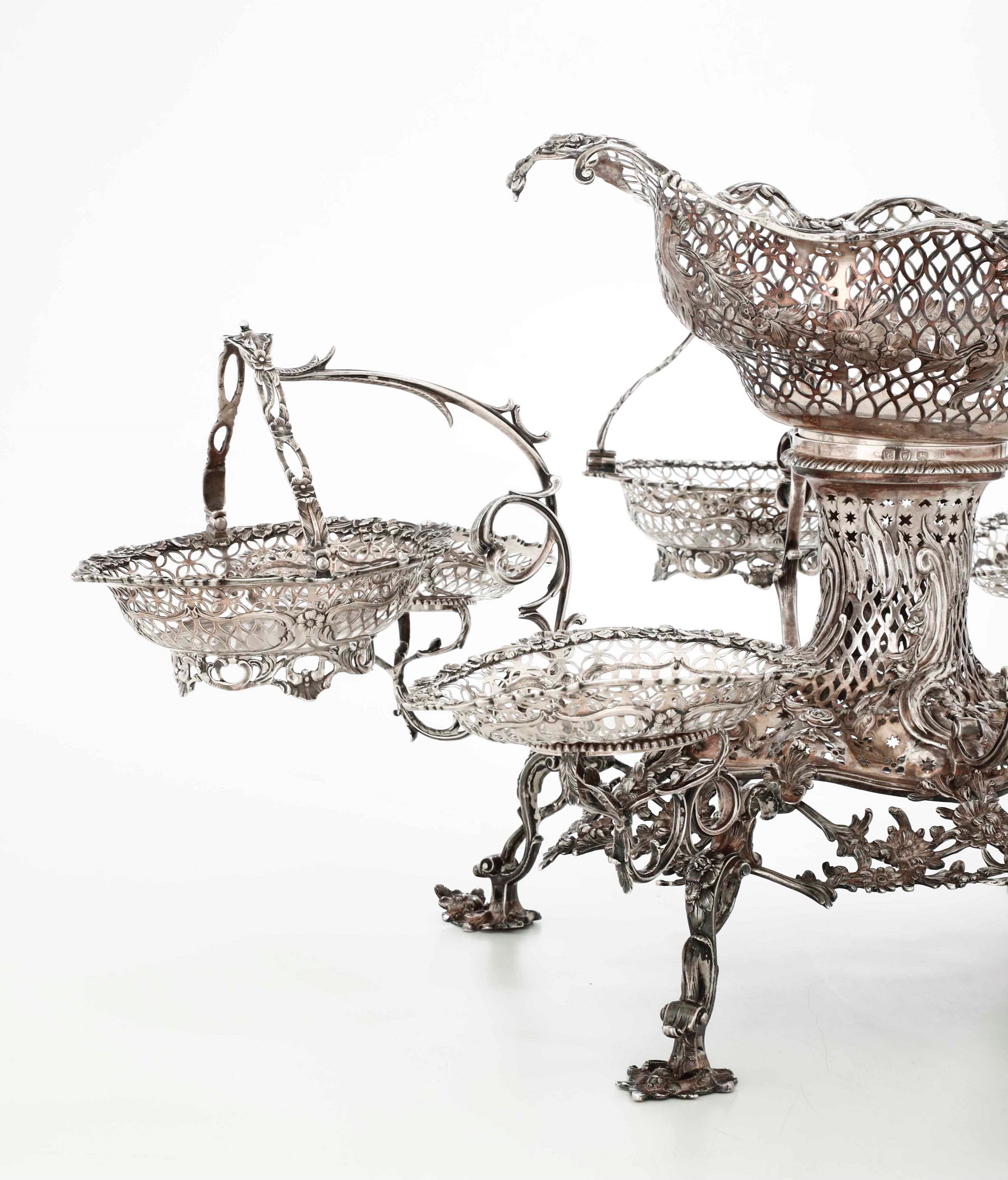 Importante epergne in argento sterling fuso, sbalzato, traforato e cesellato. Londra [..]