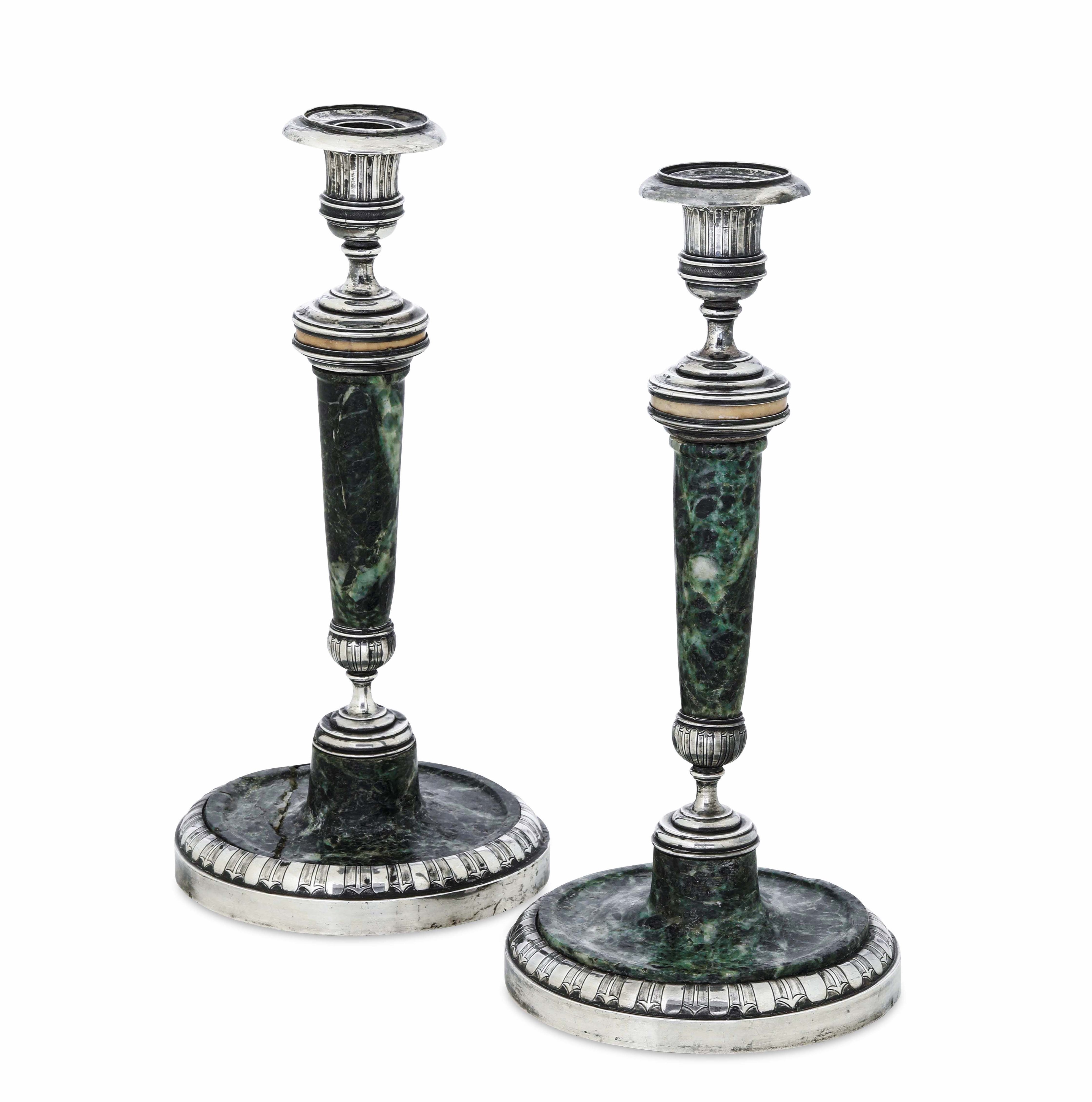 Rara coppia di candelieri. Argento fuso e cesellato. Marmo verde e giallo. Italia [..]