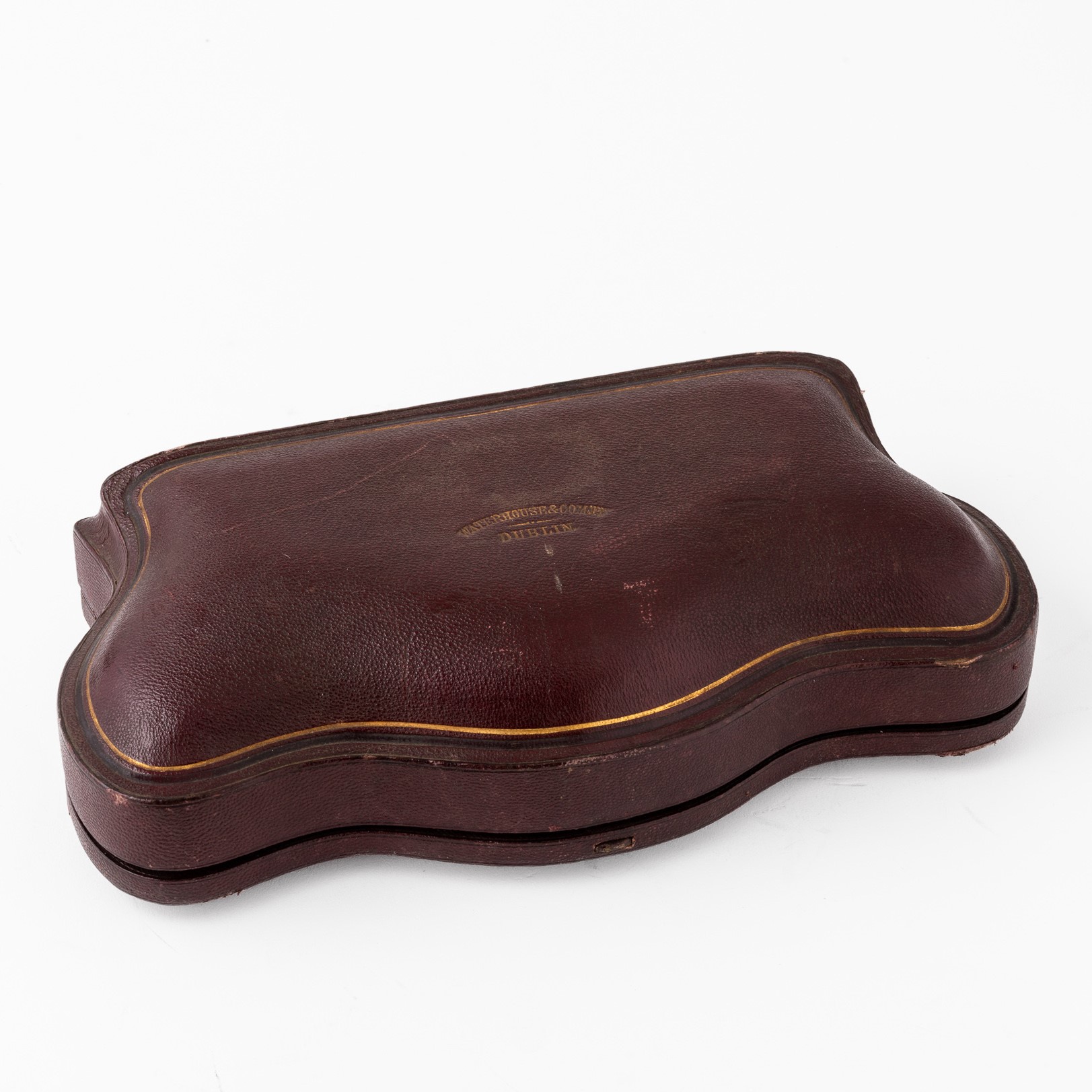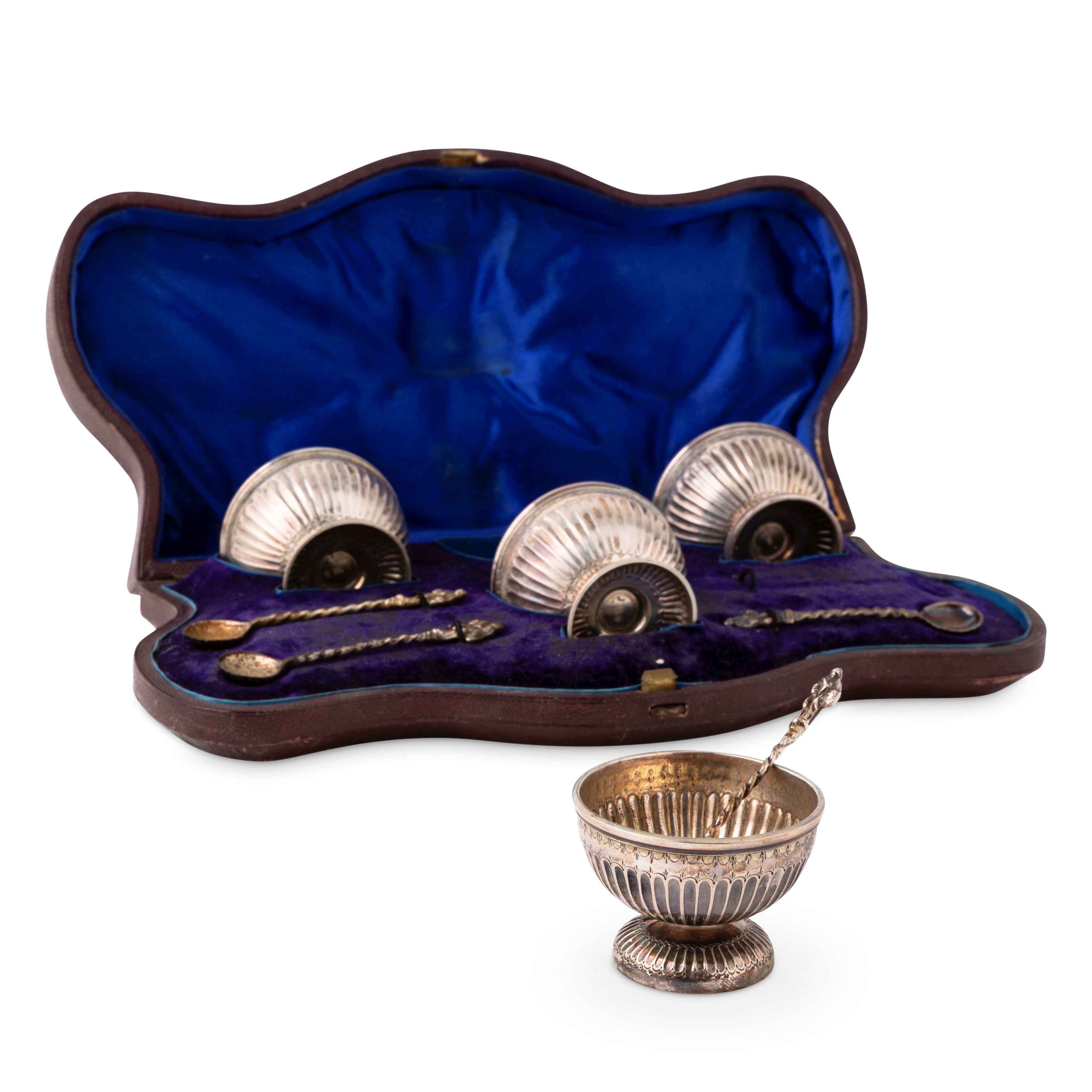 Scatola con 4 salierine e cucchiaini. Argento fuso e sagomato. Londra 1873, argentiere [..]