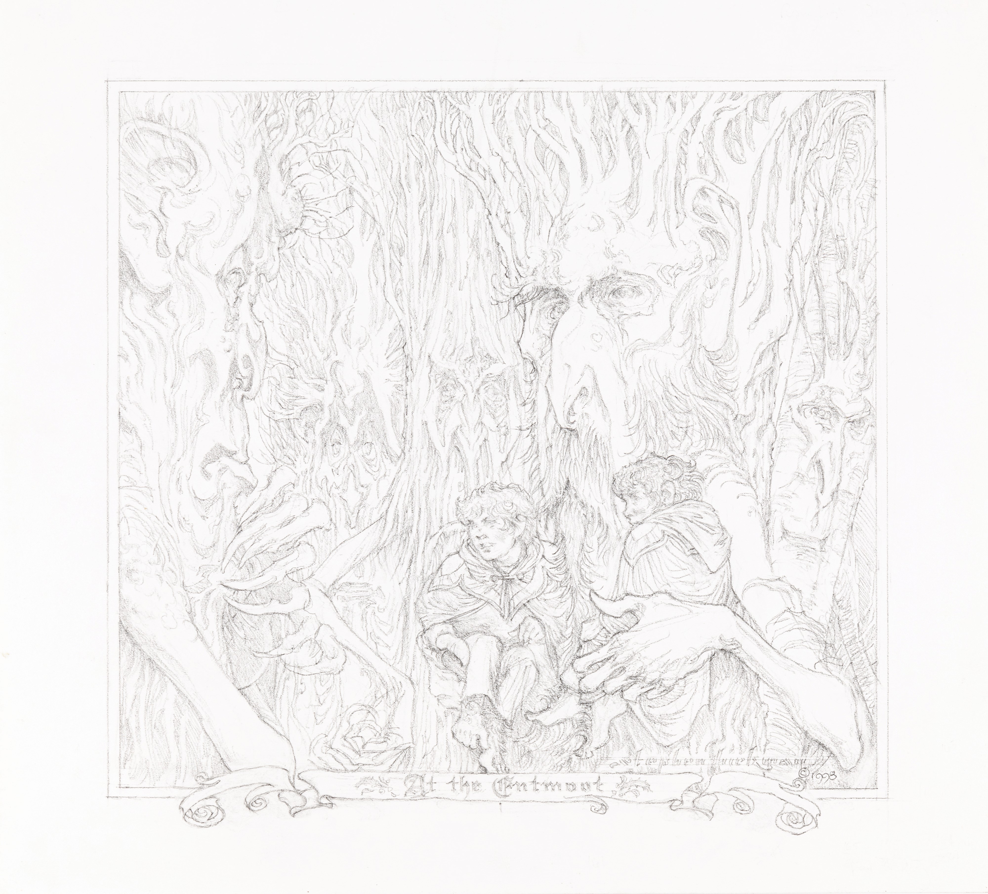 matita su cartoncino, 39 x 35,6 cm 1998 Disegno preliminare realizzato da Hickman per il suo celebre dipinto At the Entmoot del 1998, successivamente pubblicato come copertina del calendario A guide to Middle Eart 2004 e all'interno del volume The Art of Stephen Hickman, dalla Titan Books nel 2015. Firmato e datato.