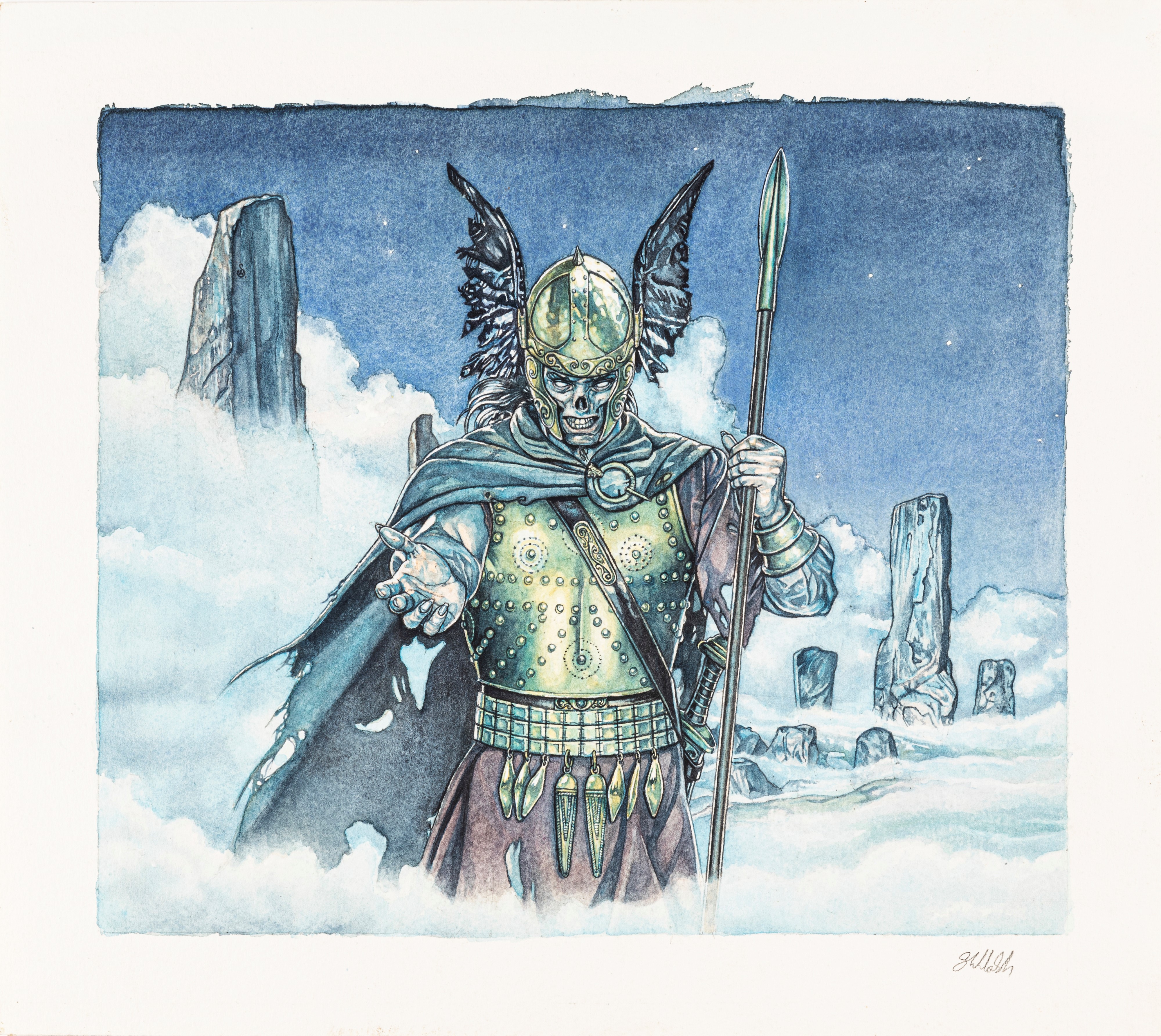 acquerello su cartoncino, 33,5 x 30 cm 1997 Illustrazione originale realizzata da Walsh per la carta da gioco Barrow Wight, pubblicata nella serie Middle-earth Collectible Card Game (MECCG) dalla Iron Crown Enterprises nel 1997. MECCG fu il primo gioco di carte collezionabili basato sul mondo di J.R.R. Tolkien nato nel 1995, ebbe l'onore di annoverare tra i suoi illustratori i più grandi artisti fantasy del momento. Si allega il disegno preliminare a matita su carta (21 x 15 cm). Firmata.