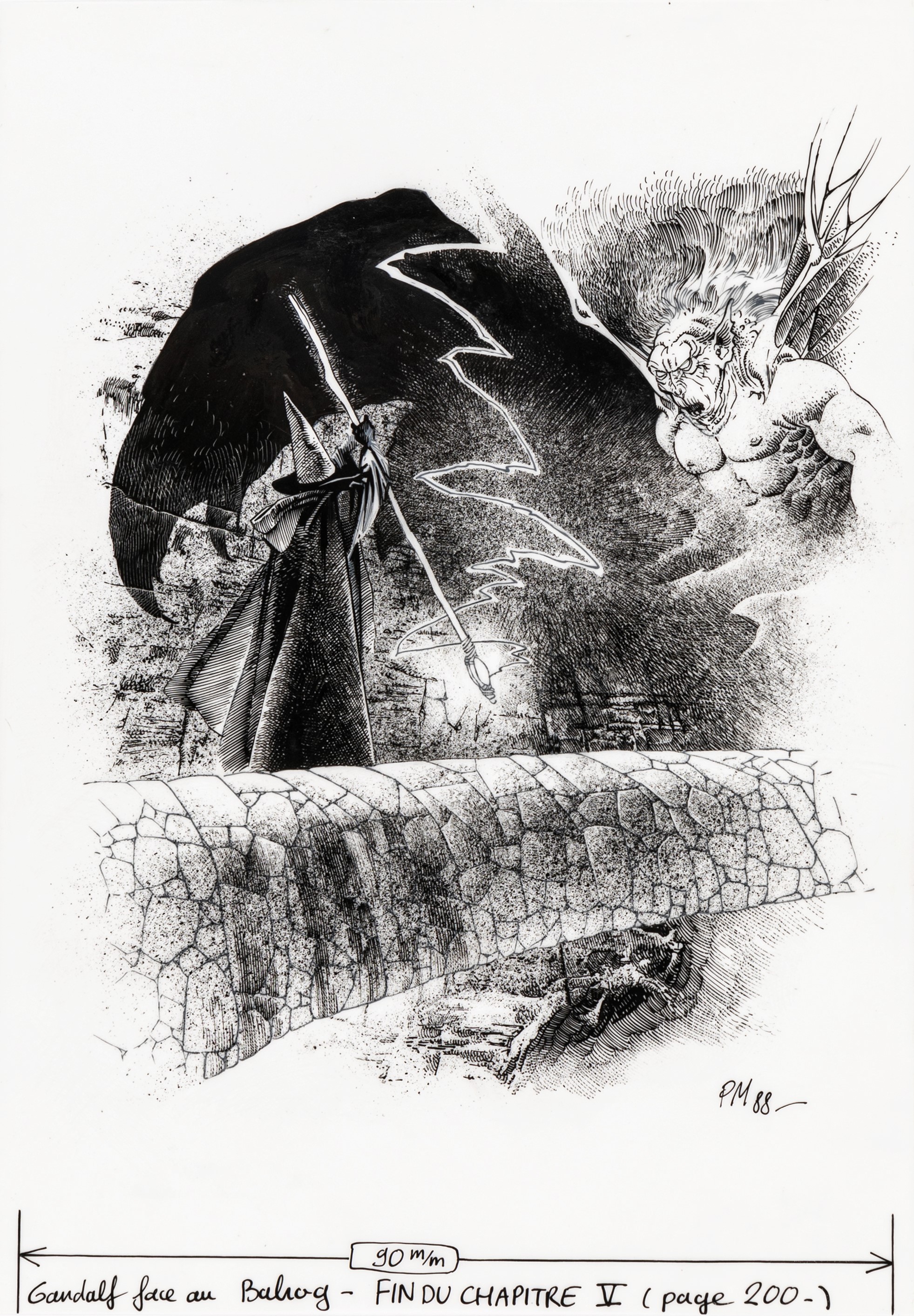 1988 Illustrazione originale realizzata da Munch per il Libro II de Le Seigneur des Anneaux, edita a pag. 200 dalla casa editrice francese Edition Gallimard nel 1988. Firmata e datata.