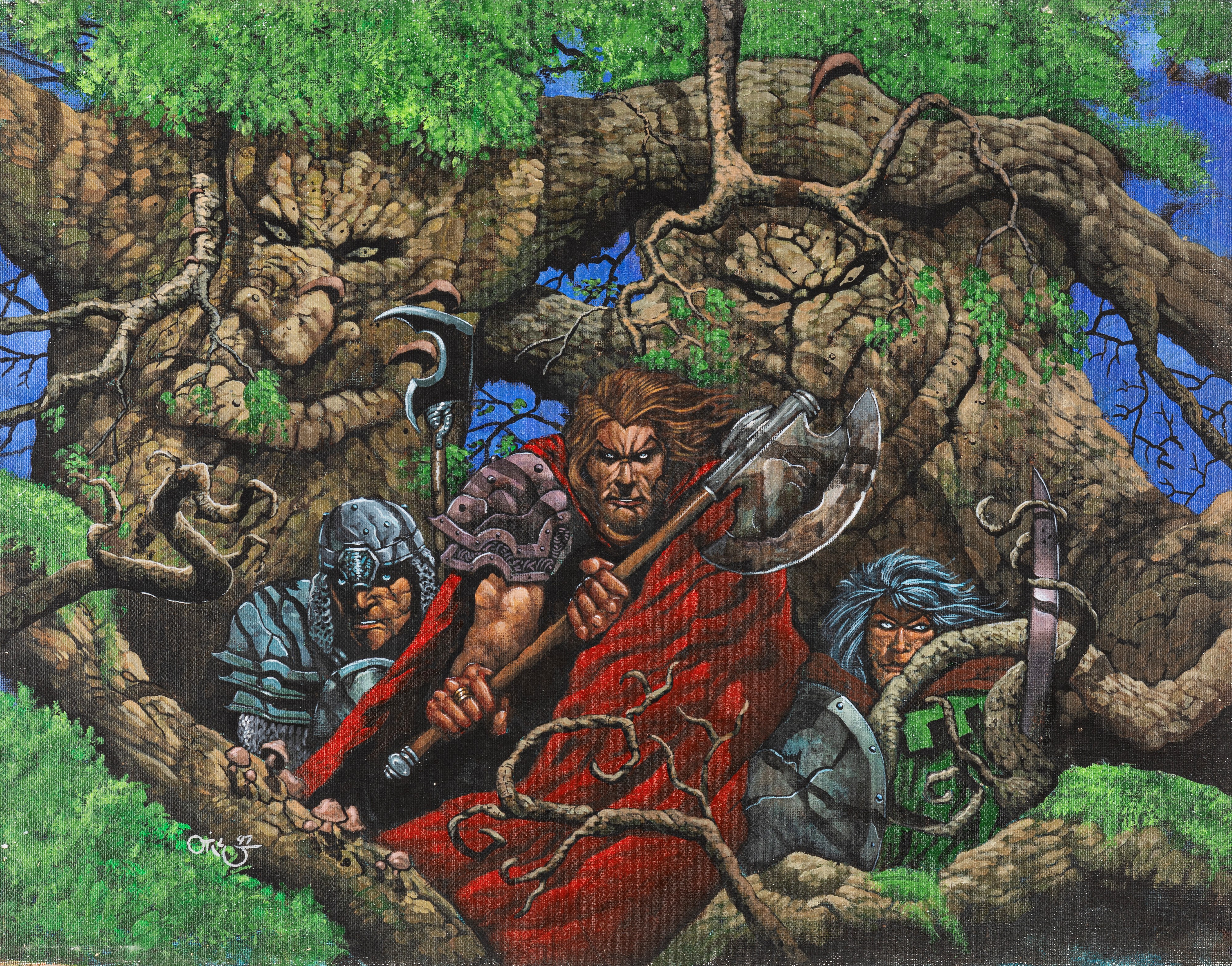 olio su cartone telato, 45,5 x 35,5 cm 1997 Illustrazione originale realizzata da Otis per la carta da gioco Girdle of Radagast, pubblicata nella serie Middle-earth Collectible Card Game (MECCG) dalla Iron Crown Enterprises nel 1997. MECCG fu il primo gioco di carte collezionabili basato sul mondo di J.R.R. Tolkien nato nel 1995, ebbe l'onore di annoverare tra i suoi illustratori i più grandi artisti fantasy del momento. Firmata e datata.