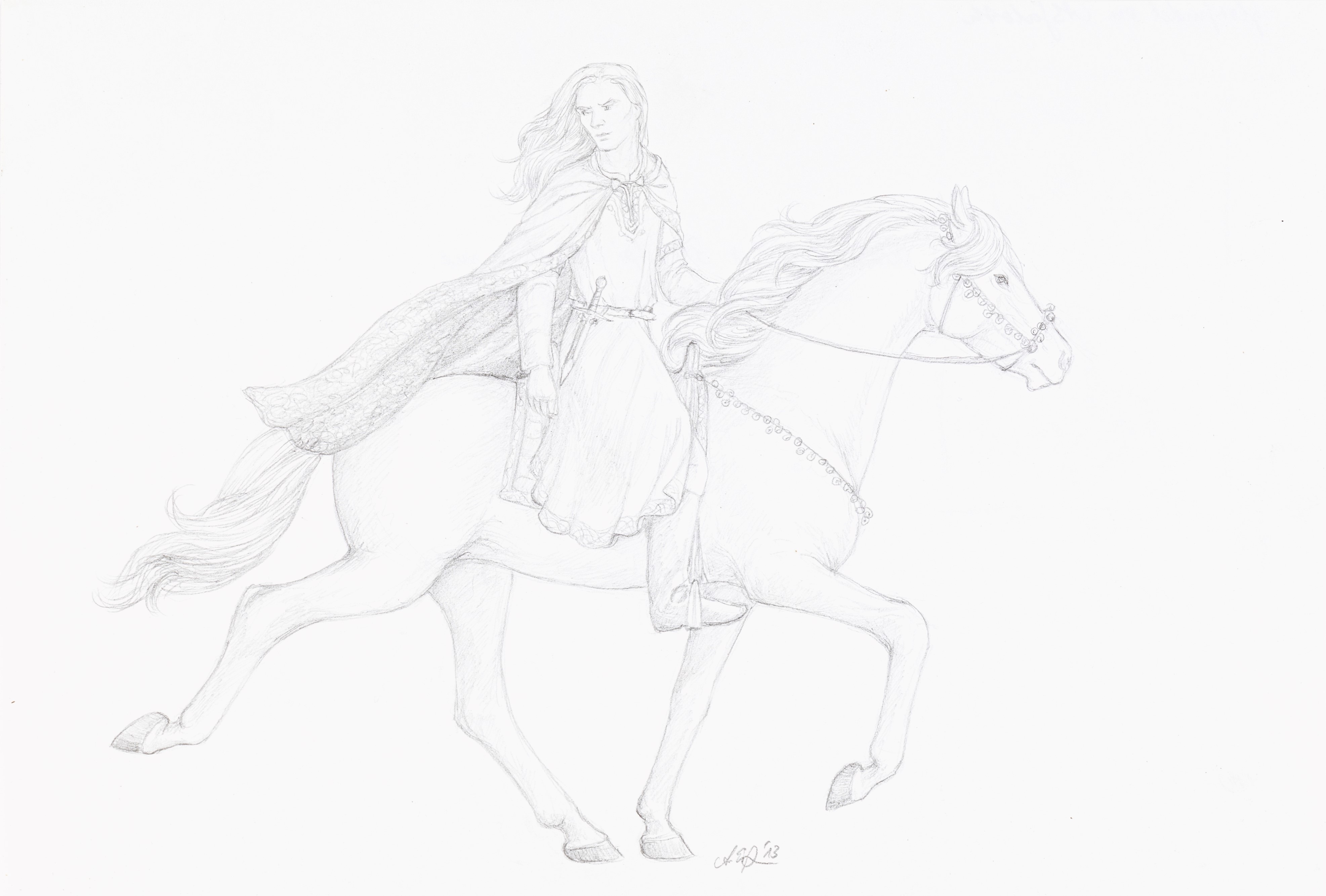 matita su carta, 30 x 20,5 cm 2013 Disegno originale realizzato dalla Eissmann nel 2013. « D'un tratto apparve un cavallo bianco che correva veloce, risplendente nelle ombre del crepuscolo. La sua bardatura scintillava e sfavillava come tempestata di gemme brillanti simili a stelle vive. La cappa del cavaliere sventolava dietro, ed il cappuccio gli ricadeva sulle spalle; i capelli dorati ondeggiavano al vento. A Frodo pareva che una luce bianca emanasse dalla figura e dalle vesti del cavaliere. Il suo linguaggio e la voce limpida e squillante dissiparono gli ultimi dubbi: il cavaliere apparteneva alla Gente Elfica. » Firmato e datato.