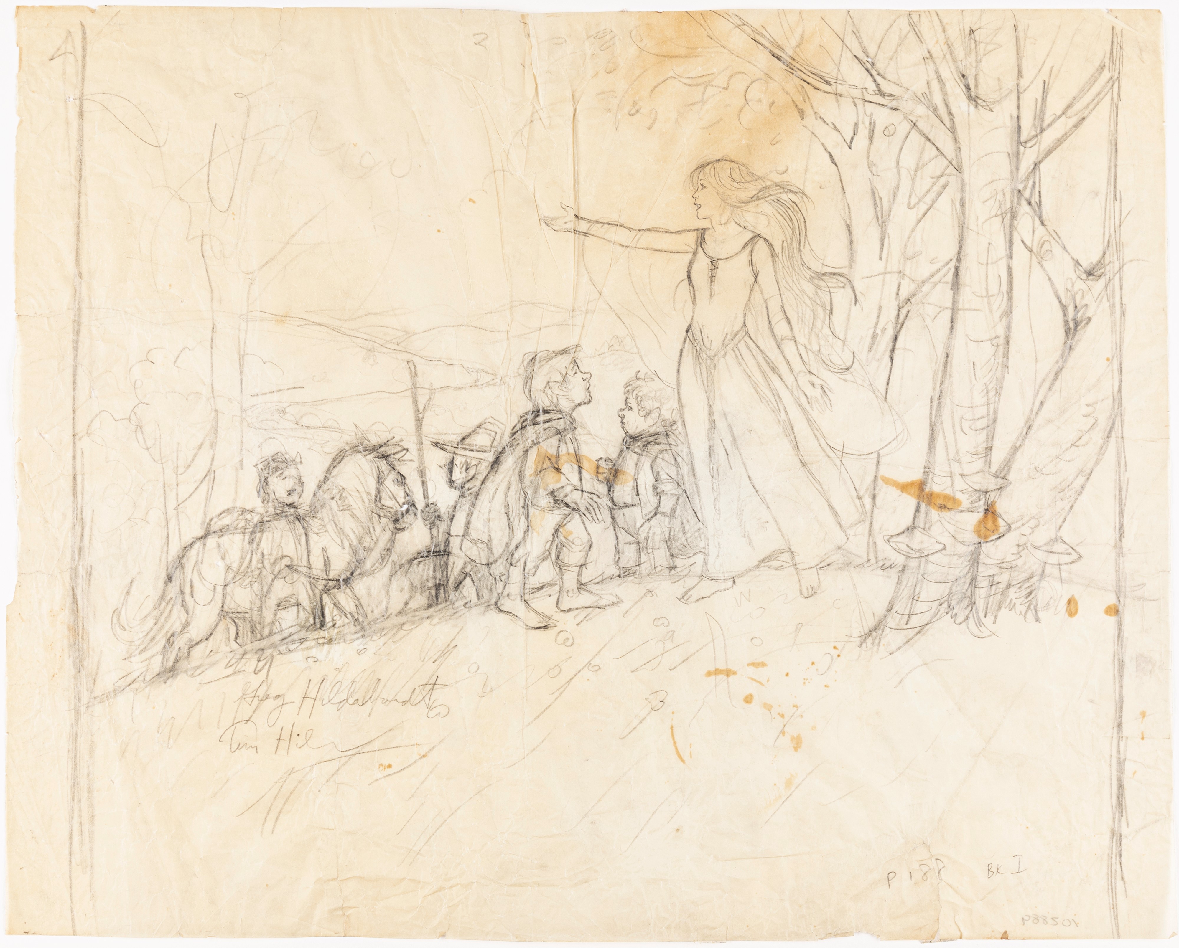 matita su lucido, 59,5 x 48 cm 1977 Disegno preliminare realizzato dai fratelli Hildebrandt per il loro celebre dipinto intitolato Goldberry and the Hobbits, edito per la prima volta nel calendario J.R.R. Tolkien Calendar 1977 dalla Ballantine Books nel 1977. La presente opera è stata pubblicata sul volume Greg and Tim Hildebrandt: the Tolkien years, dalla Watson Guptill Publications nel 2002. Un pezzo da museo. Diverse pieghe, piccoli fori e piccoli strappi e mancanze ai margini. Firmato da Greg e Tim Hildebrandt.