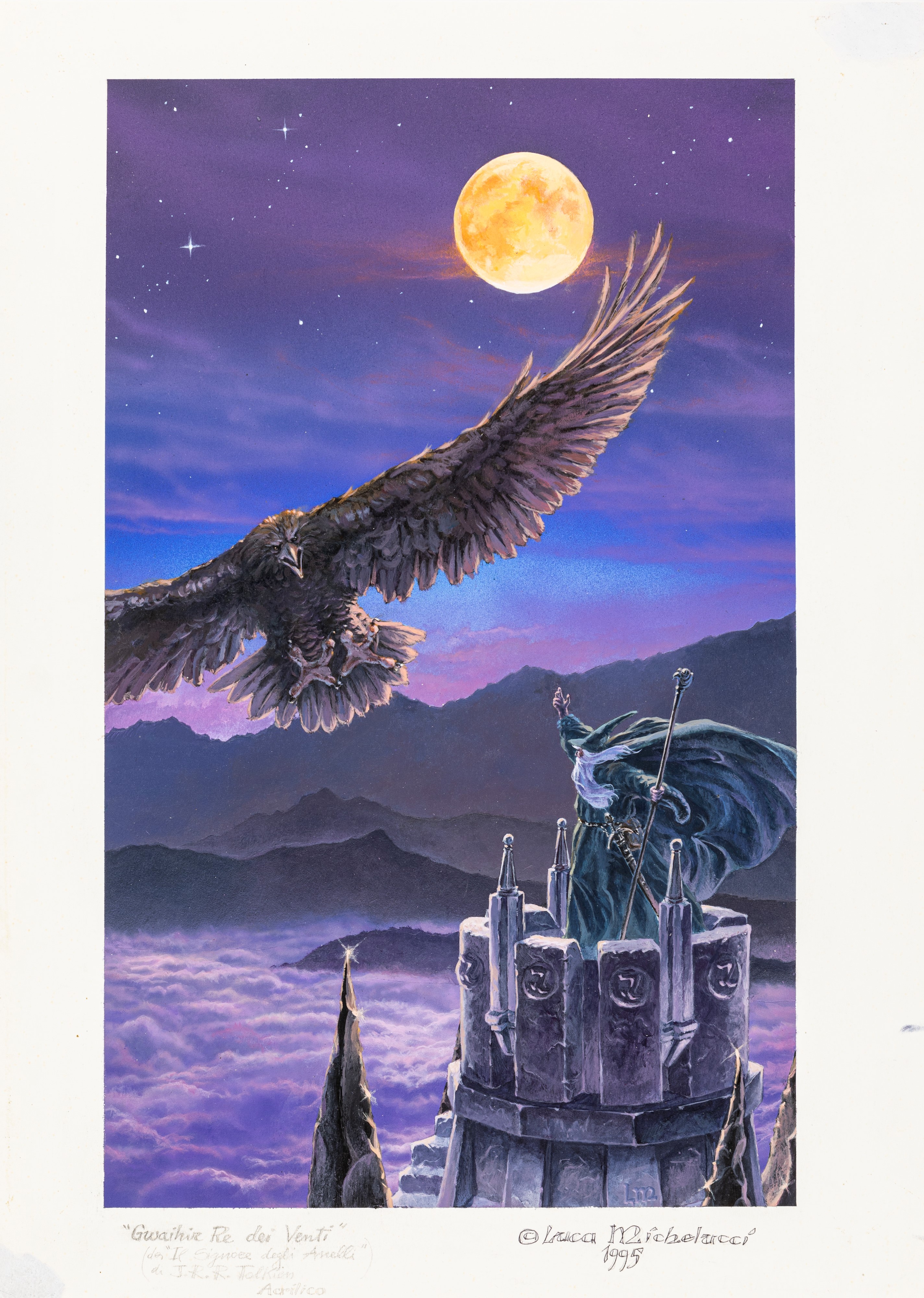 acrilici e aerografo su cartoncino, 35 x 48 cm 1995 Illustrazione originale realizzata da Michelucci per Gwaihir re dei venti, pubblicata per la prima volta nel celebre J.R.R. Tolkien Calendar 1999 per il mese di Luglio dalla Rusconi Libri nel 1998. Michelucci con questo calendario Rusconi si è affermato a livello internazionale come uno dei più talentuosi ed apprezzati interpreti dell'universo tolkeniano. « In una notte di luna di fine estate, Gwaihir, la più veloce delle Grandi Aquile, libera Gandalf imprigionato nella torre di Orthanc dall'incantesimo di Saruman il Bianco. » Un pezzo da museo. Firmata, datata e titolata.