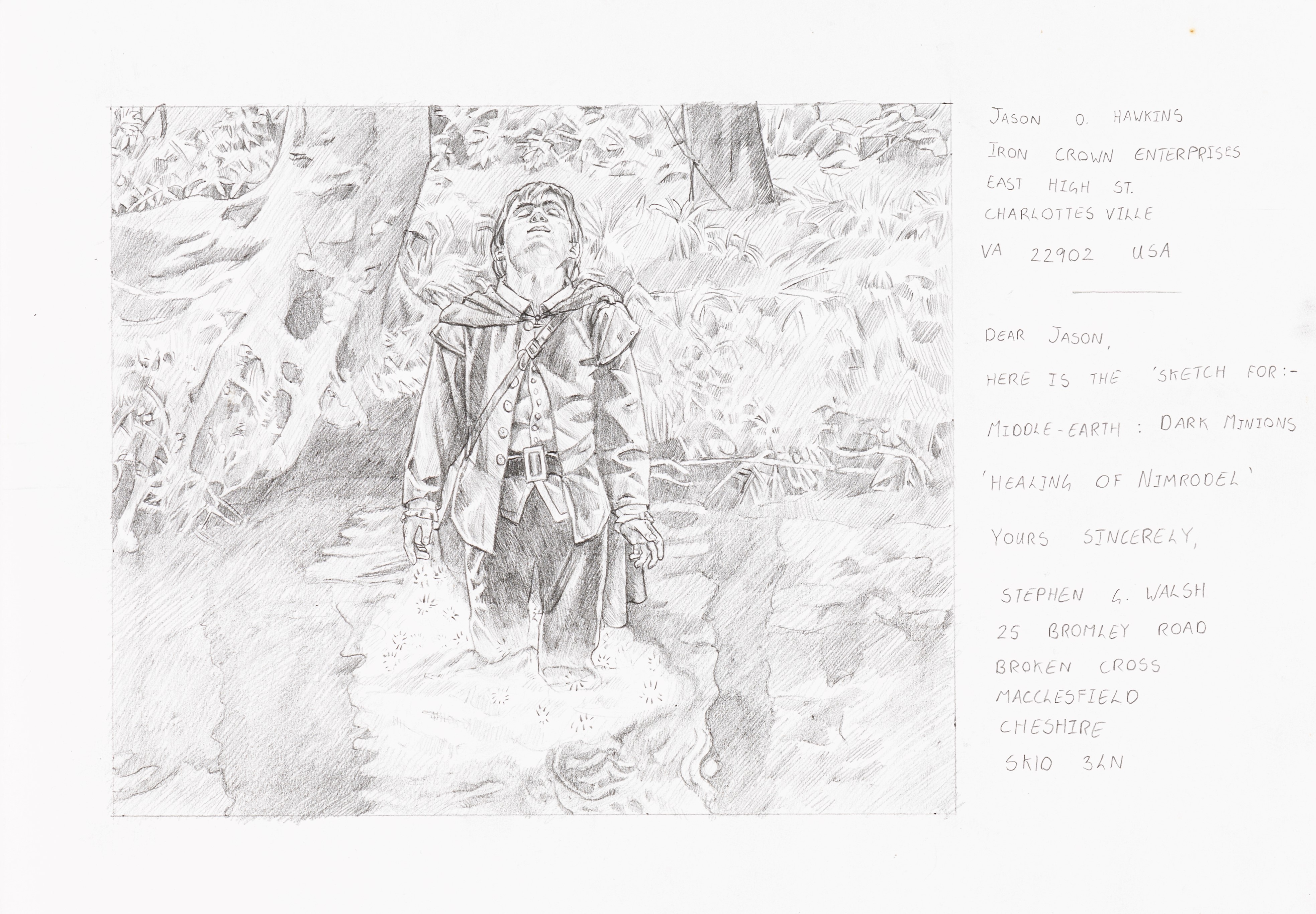 matita su cartoncino, 29,5 x 21 cm 1996 Disegno preliminare realizzato da Walsh per la carta da gioco Healing of Nimrodel, pubblicata nella serie Middle-earth Collectible Card Game (MECCG) dalla Iron Crown Enterprises nel 1996. MECCG fu il primo gioco di carte collezionabili basato sul mondo di J.R.R. Tolkien nato nel 1995, ebbe l'onore di annoverare tra i suoi illustratori i più grandi artisti fantasy del momento.