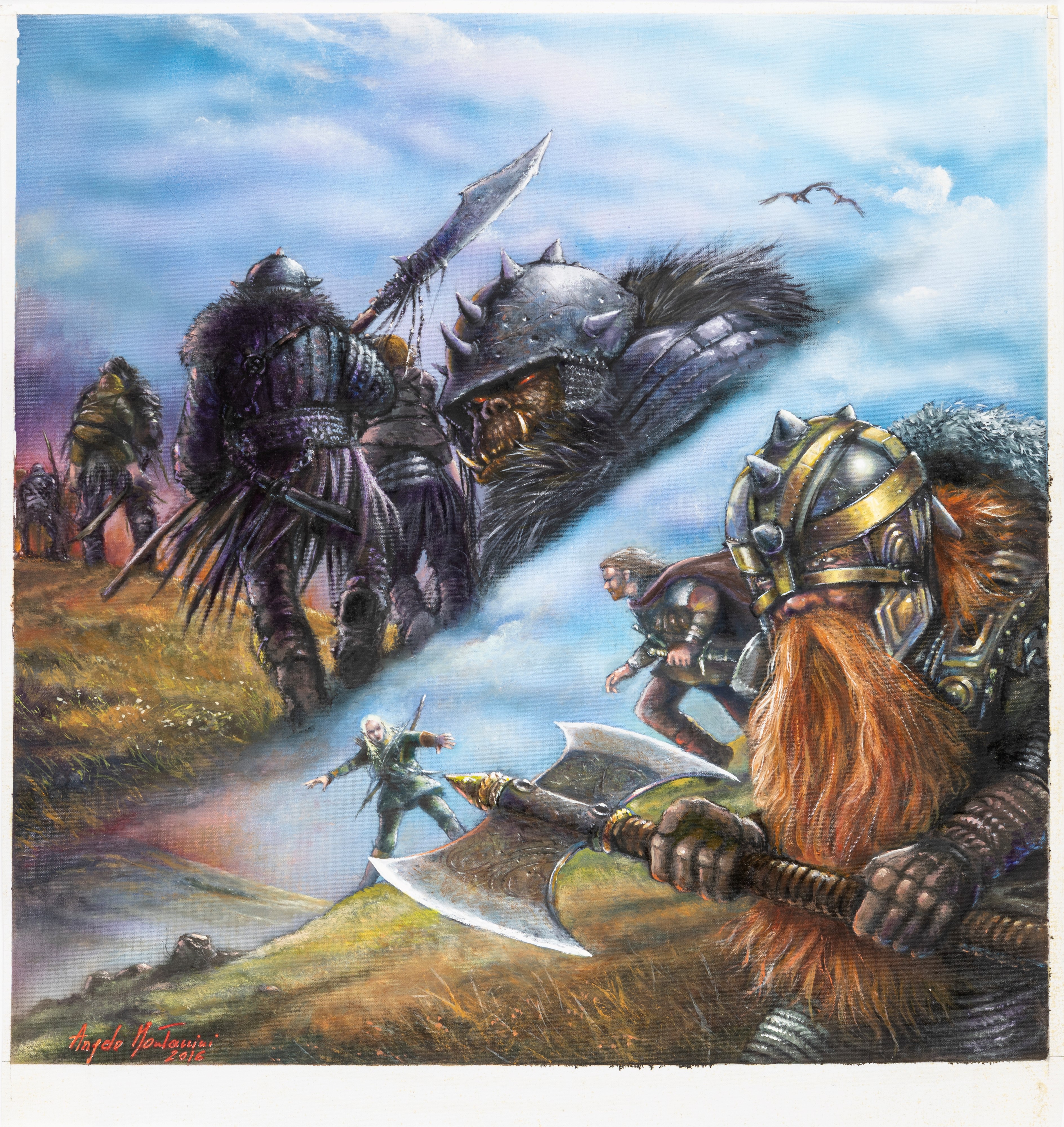 tempera su tela, 36 x 38 cm 2016 Illustrazione originale realizzata da Montanini per La caccia, pubblicata per la prima volta nel calendario Lords for the Ring: I Maestri del fantasy italiano incontrano Tolkien edito dalla Associazione Italiana Studi Tolkieniani nel 2017. Si allega il disegno preliminare a matita su carta (35 x 30 cm). Firmata e datata.