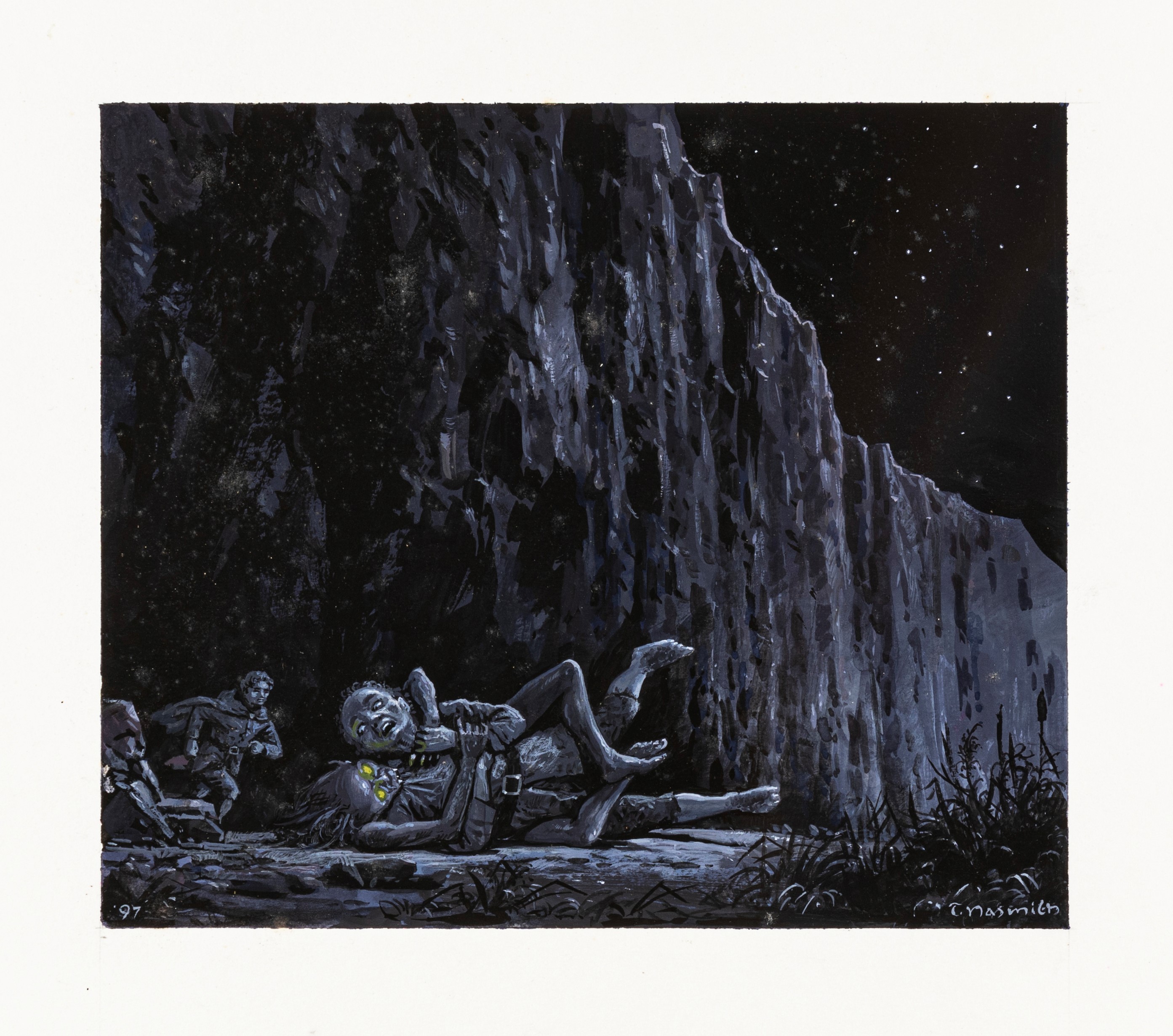 tempera su cartone, 20 x 18 cm 1997 Illustrazione originale realizzata da Nasmith per la carta da gioco Near to Hear a Whisper, pubblicata nella serie Middle-earth Collectible Card Game (MECCG) dalla Iron Crown Enterprises nel 1997. MECCG fu il primo gioco di carte collezionabili basato sul mondo di J.R.R. Tolkien nato nel 1995, ebbe l'onore di annoverare tra i suoi illustratori i più grandi artisti fantasy del momento. Una delle opere di Nasmith che influenzarono la realizzazione grafica della trilogia di Peter Jackson. Firmata e datata.