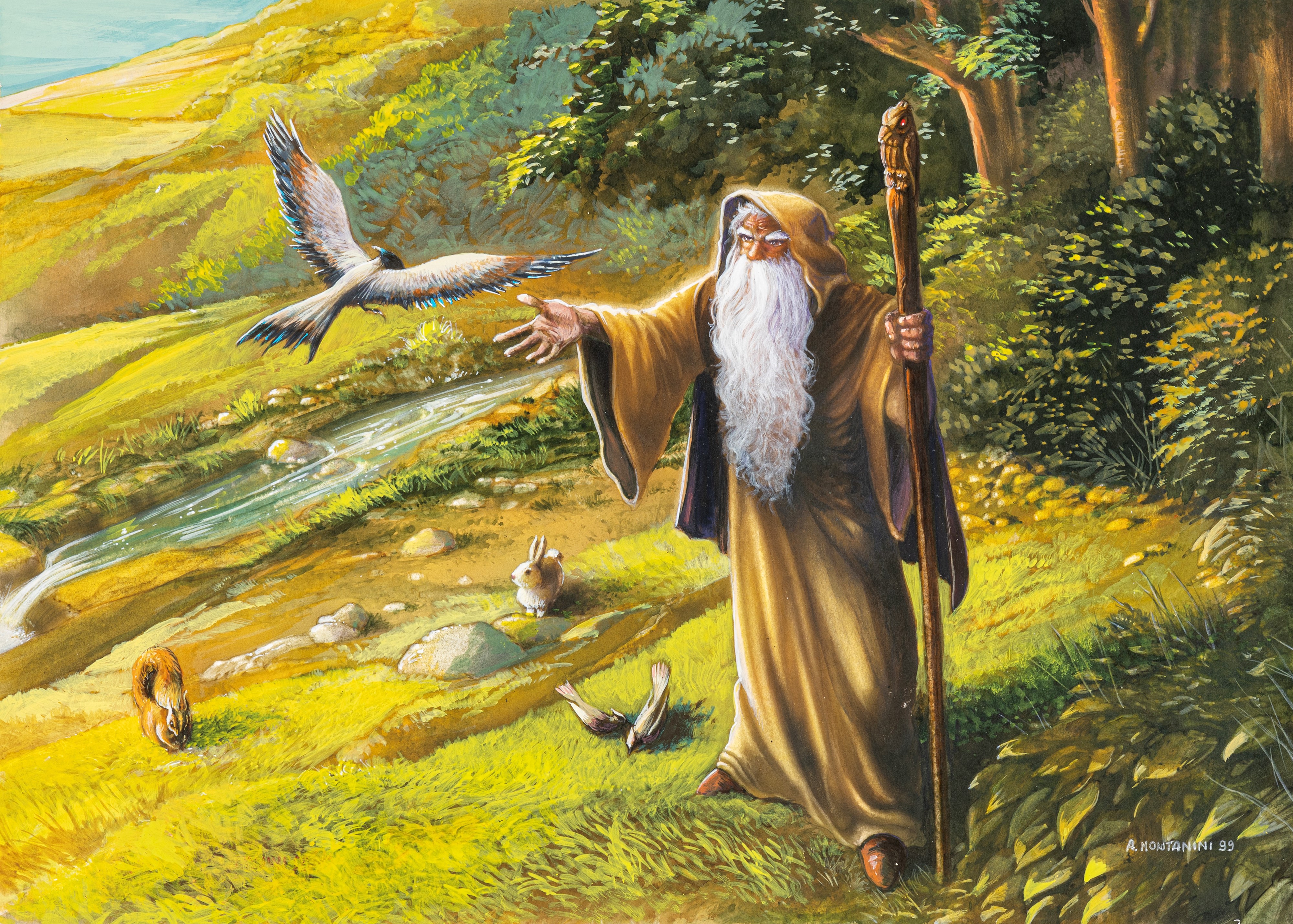 china, tempera e aerografo su cartoncino, 36,5 x 25,5 cm 1999 Illustrazione originale realizzata da Montanini per Radagast il mago, pubblicata per la prima volta nel celebre J.R.R. Tolkien Calendar 2000 per il mese di Maggio dalla Rusconi Libri nel 1999. Montanini per il calendario Rusconi ha dato vita alle immagini più celebri ed evocative da lui mai realizzate per l'universo tolkeniano. « Uno stregone di grande valore...esperto di erbe e bestie, e amico soprattutto degli uccelli. » Un pezzo da museo. Firmata e datata.