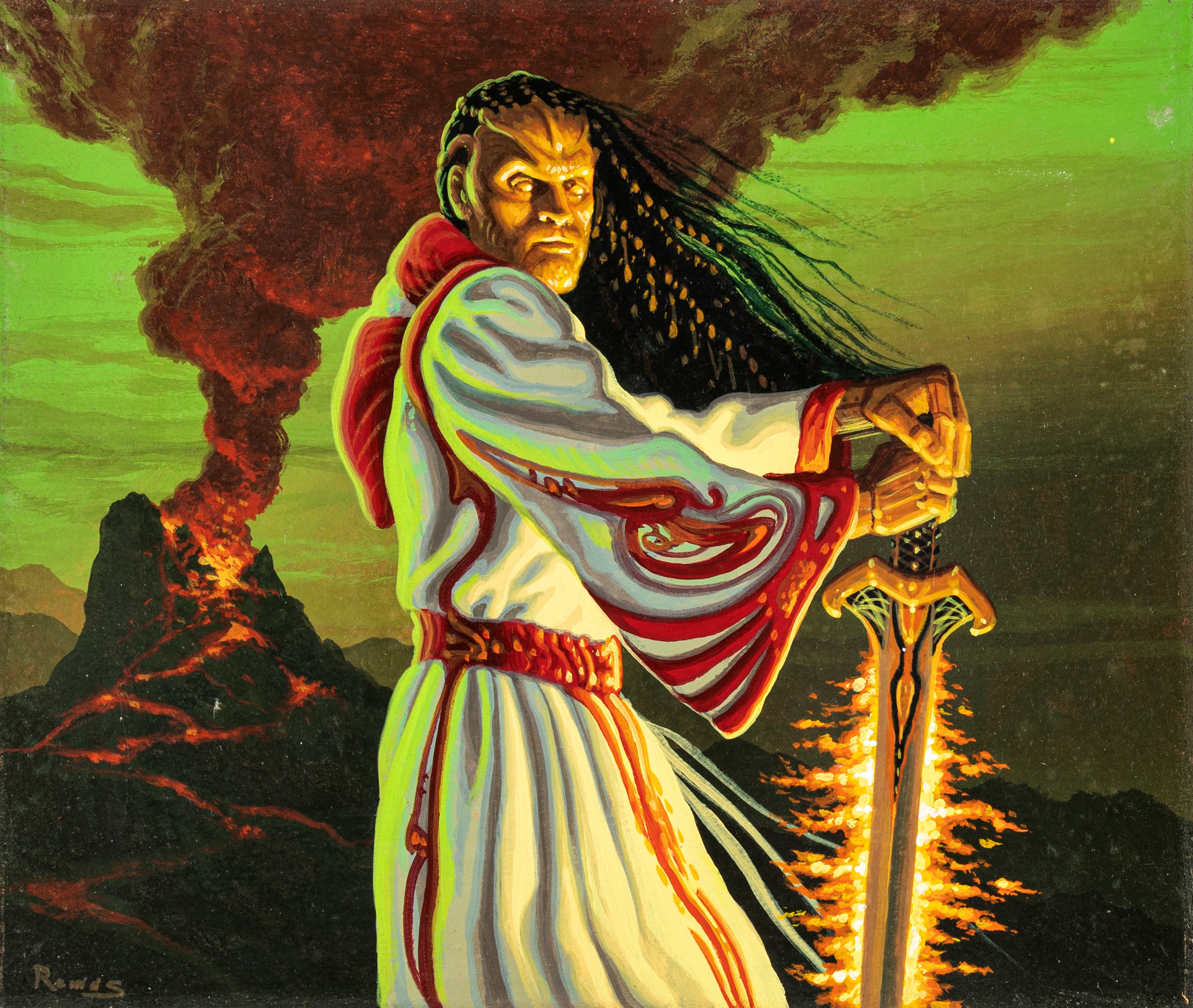 acrilici su cartone, 22 x 18,5 cm 1997 Illustrazione originale realizzata da Kukalis per la carta da gioco Ren the Ringwraith, pubblicata nella serie Middle-earth Collectible Card Game (MECCG) dalla Iron Crown Enterprises nel 1997. MECCG fu il primo gioco di carte collezionabili basato sul mondo di J.R.R. Tolkien nato nel 1995, ebbe l'onore di annoverare tra i suoi illustratori i più grandi artisti fantasy del momento. Si allega la carta da gioco. Firmata.