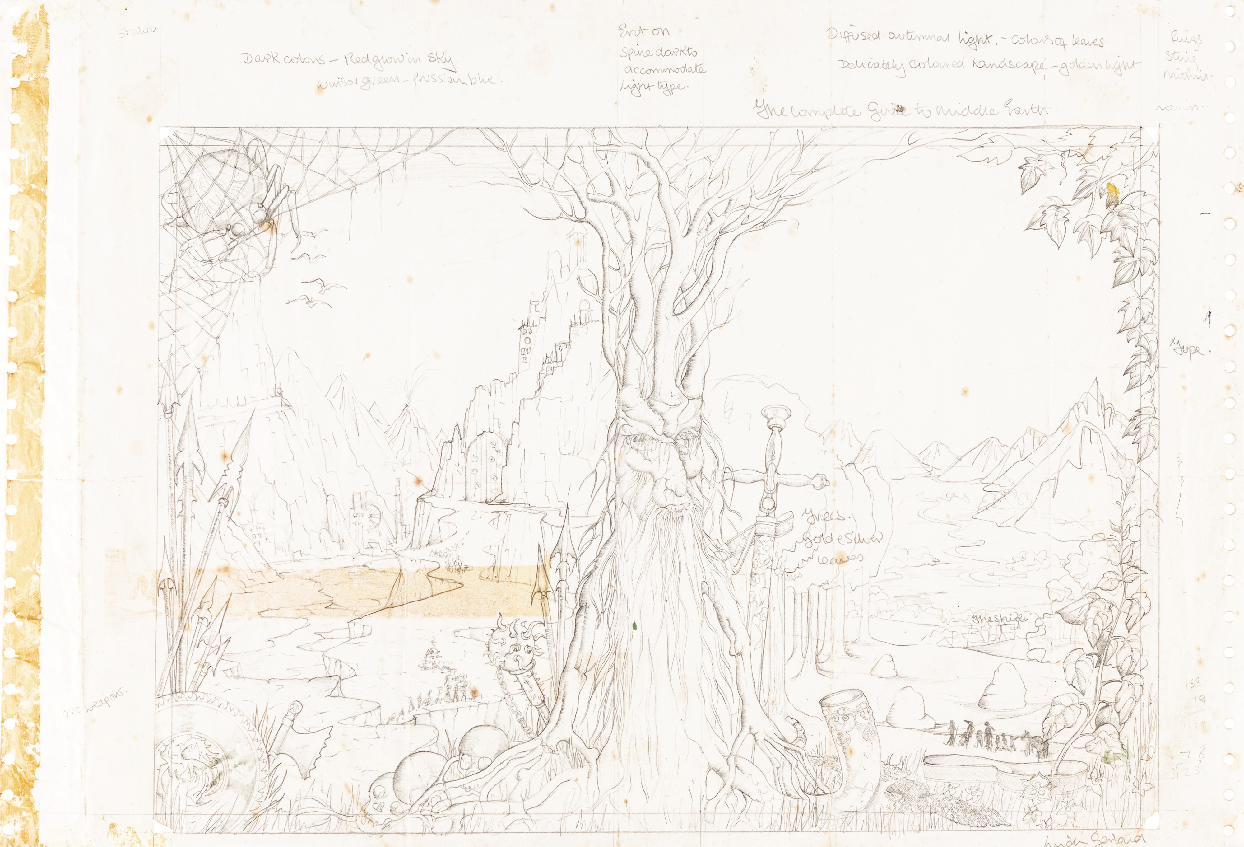 matita su carta, 45 x 30,5 cm 1978 Disegno preliminare realizzato dalla Garland per la copertina, la costa e la quarta di copertina del celebre volume The Complete Guide to Middle-Earth, edito per la prima volta da George Allen & Unwin nel 1978. Una delle opere più iconiche dell'artista inglese. Alcune pieghe e tracce di scotch. Firmato.