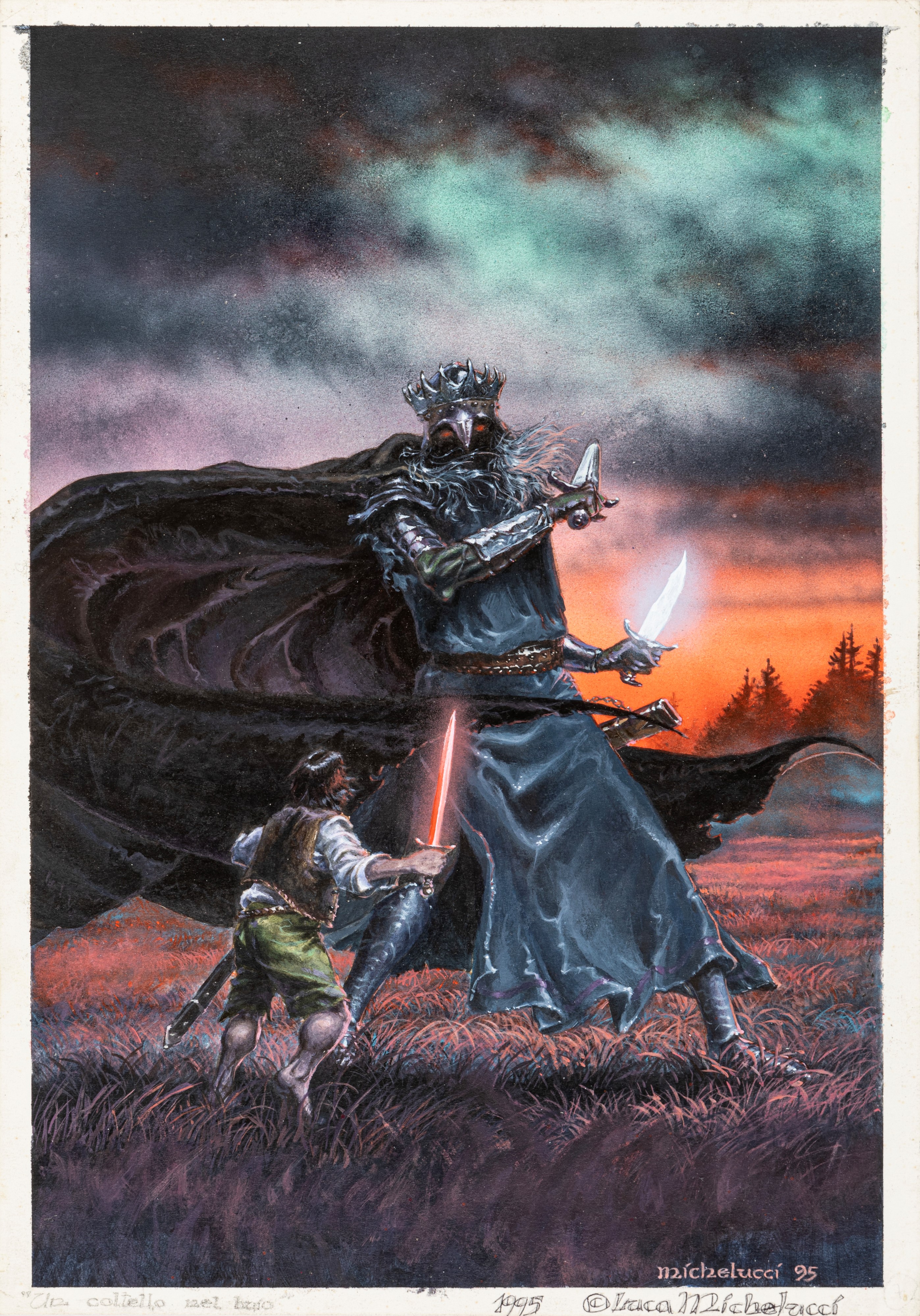 acrilici e aerografo su cartoncino, 25,5 x 36,5 cm 1995 Illustrazione originale realizzata da Michelucci per Un coltello nel buio, pubblicata per la prima volta nel celebre J.R.R. Tolkien Calendar 1999 per il mese di Giugno dalla Rusconi Libri nel 1998. Michelucci con questo calendario Rusconi si è affermato a livello internazionale come uno dei più talentuosi ed apprezzati interpreti dell'universo tolkeniano. «Entità terrificante, lunghi capelli luccicanti sotto l'elmo coronato è armato di una spada e di un coltello ardente di luce bianca, il Re Stregone attacca Frodo, il Portatore dell'Anello. » Un pezzo da museo. Firmata, datata e titolata.