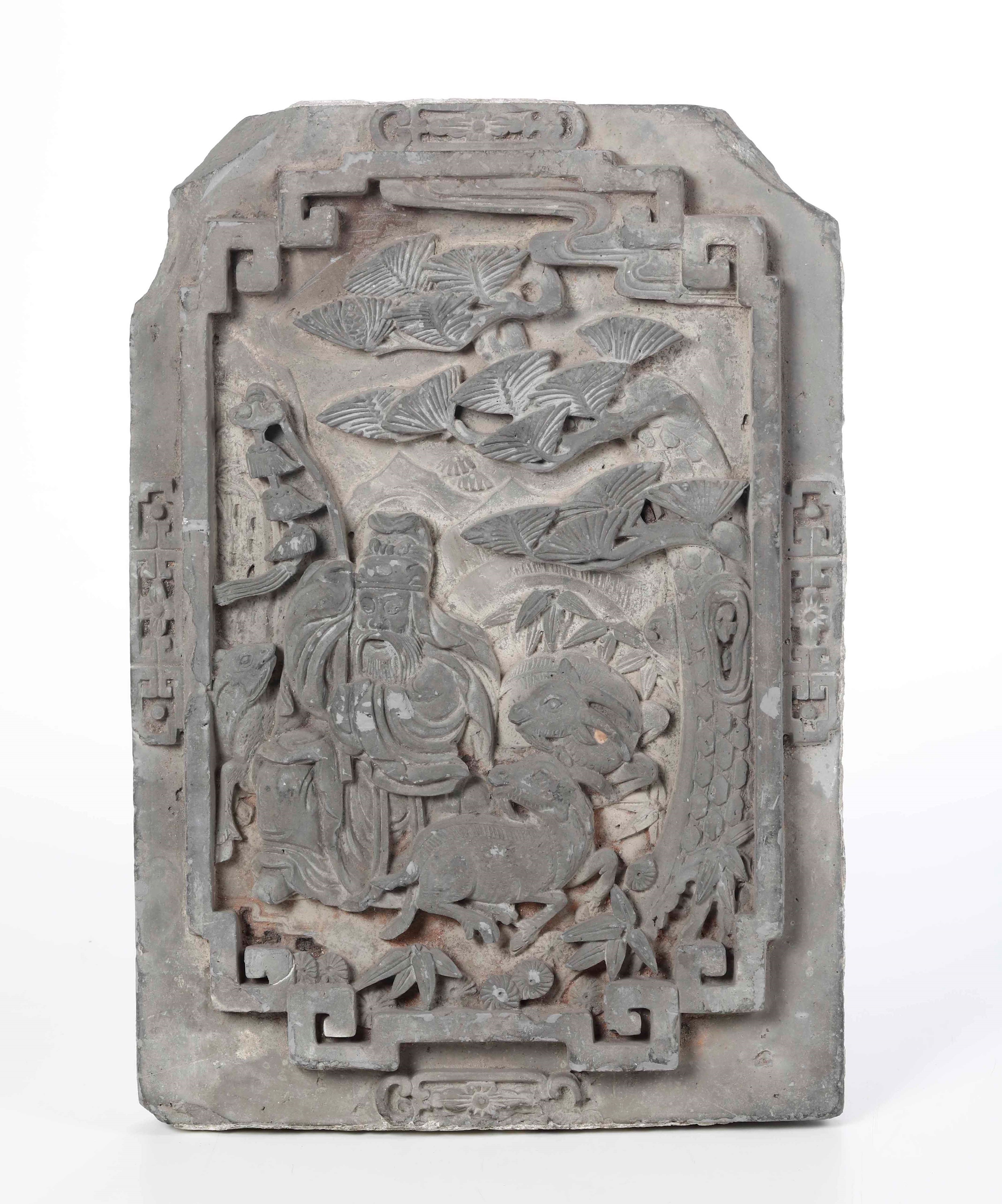Bassorilievo scolpito in pietra con figura di saggio entro paesaggio, Cina, XX s [..]