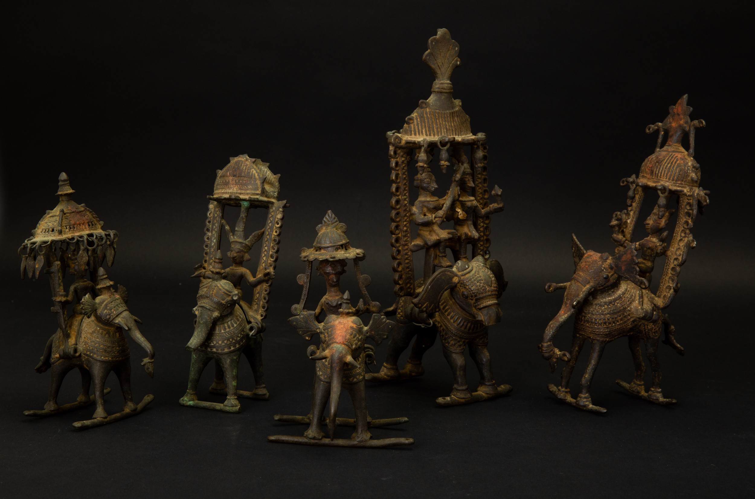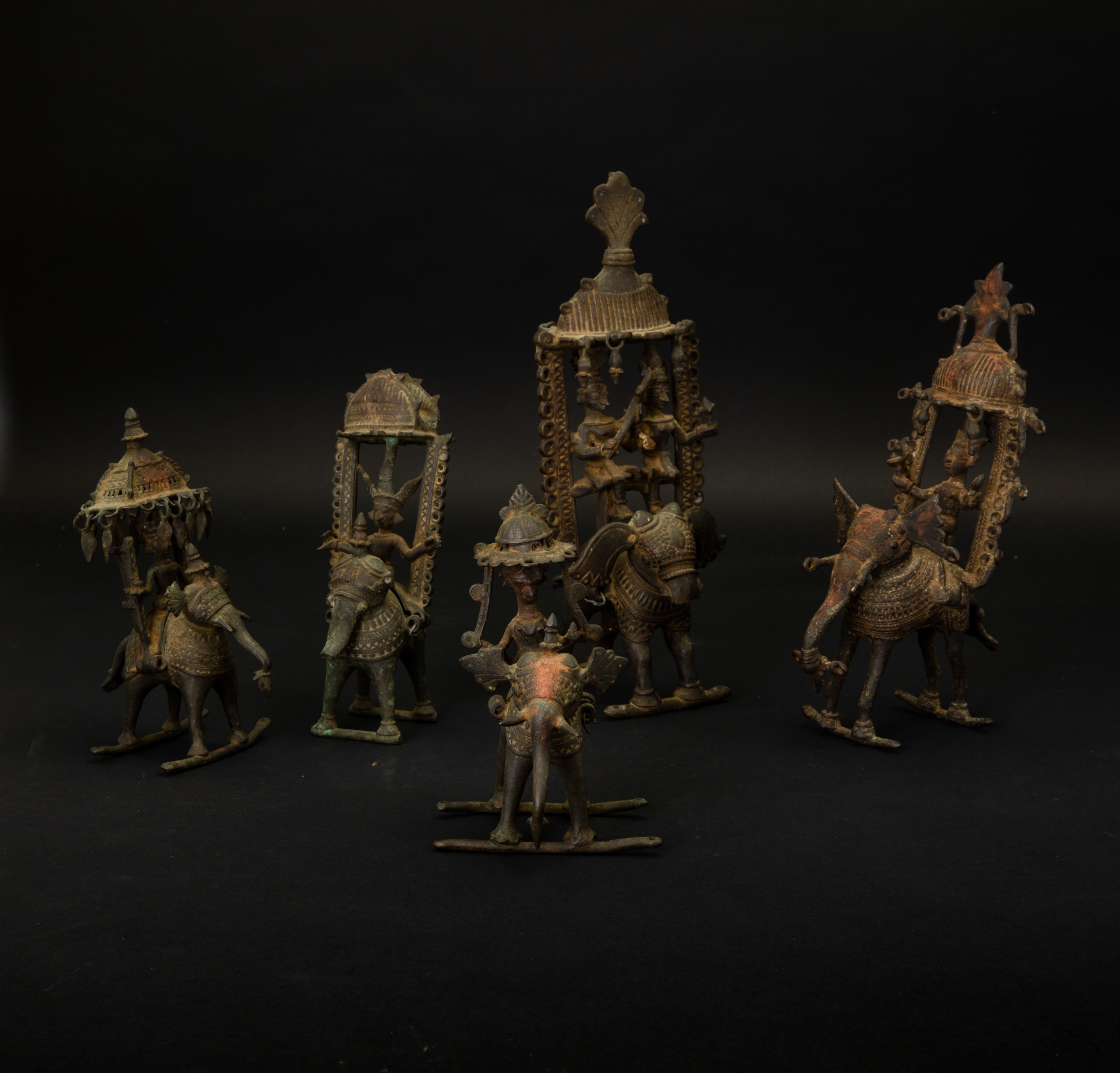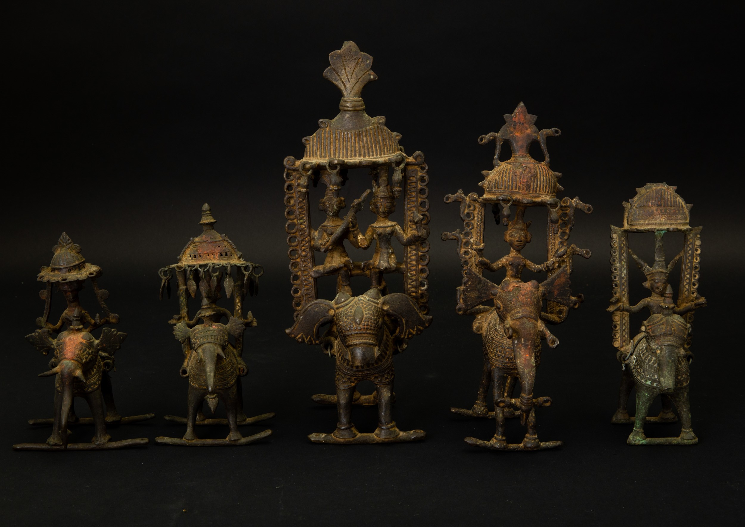 Cinque bronzetti con divinità assise su elefanti entro coperture decorate con pinnacoli, [..]