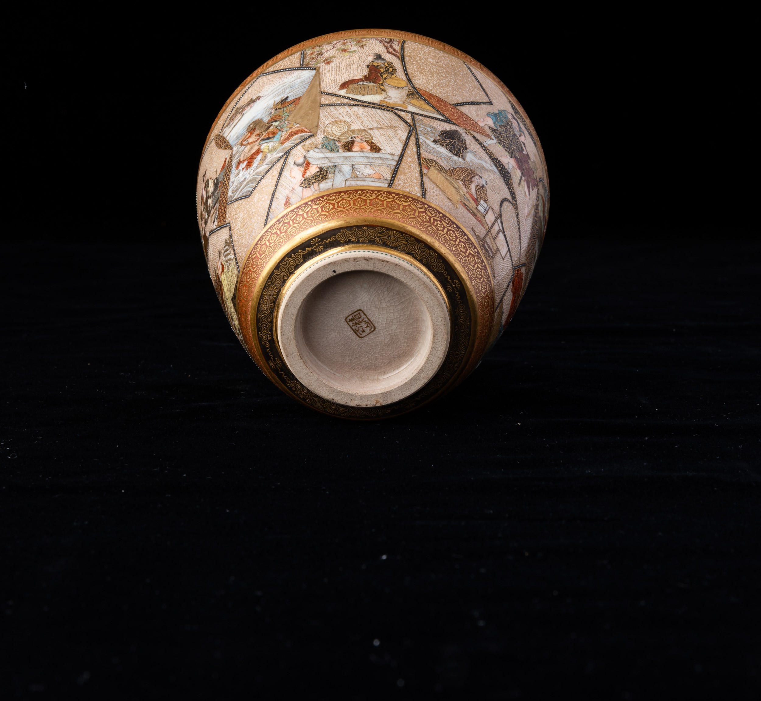Coppa in porcellana Satsuma con decori floreali e scene di vita comune entro riserve, [..]