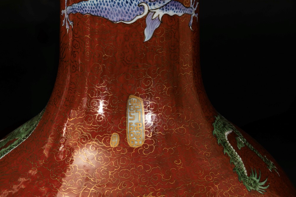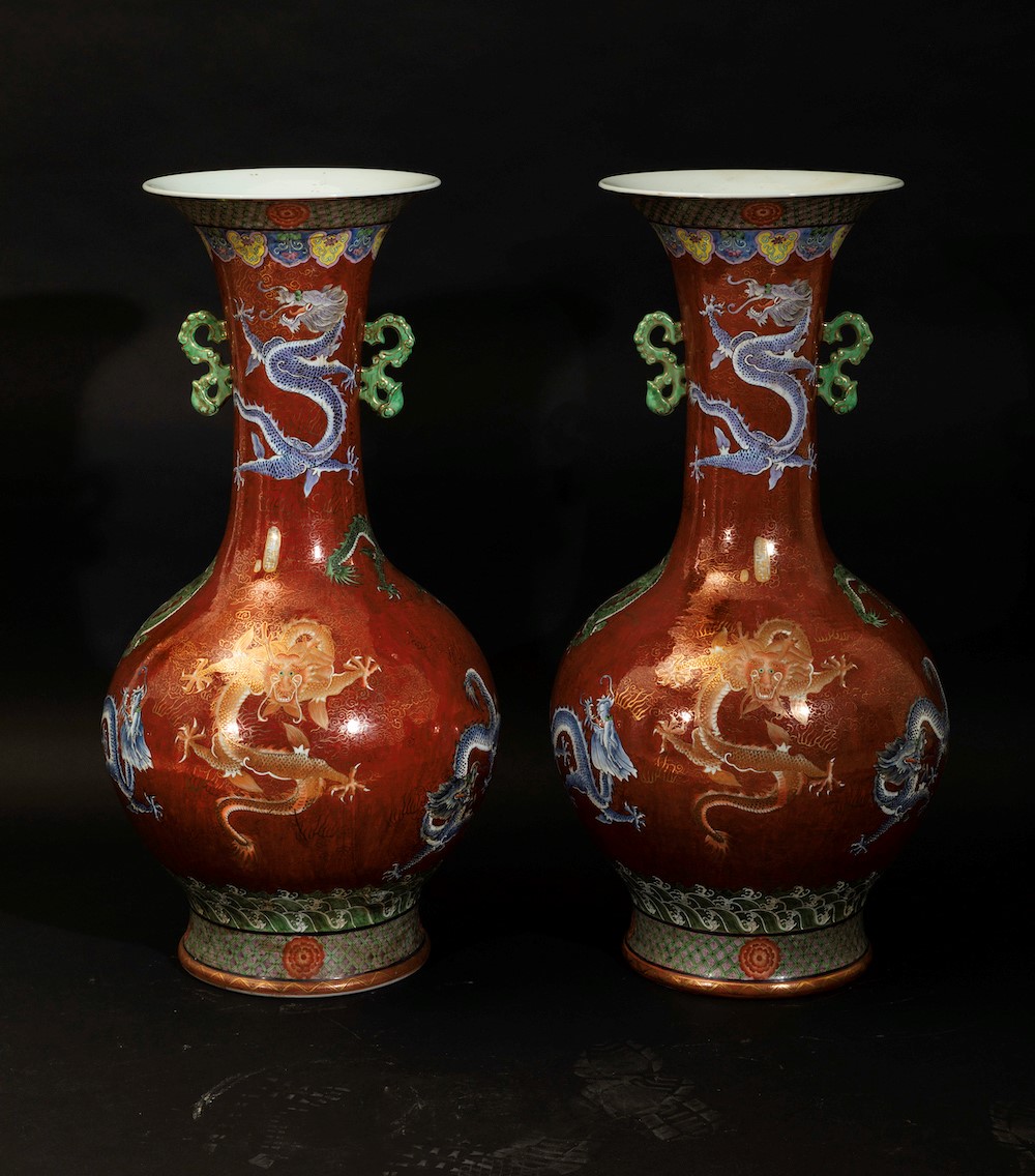 Coppia di grandi vasi a doppia ansa in porcellana a smalti policromi con figure [..]