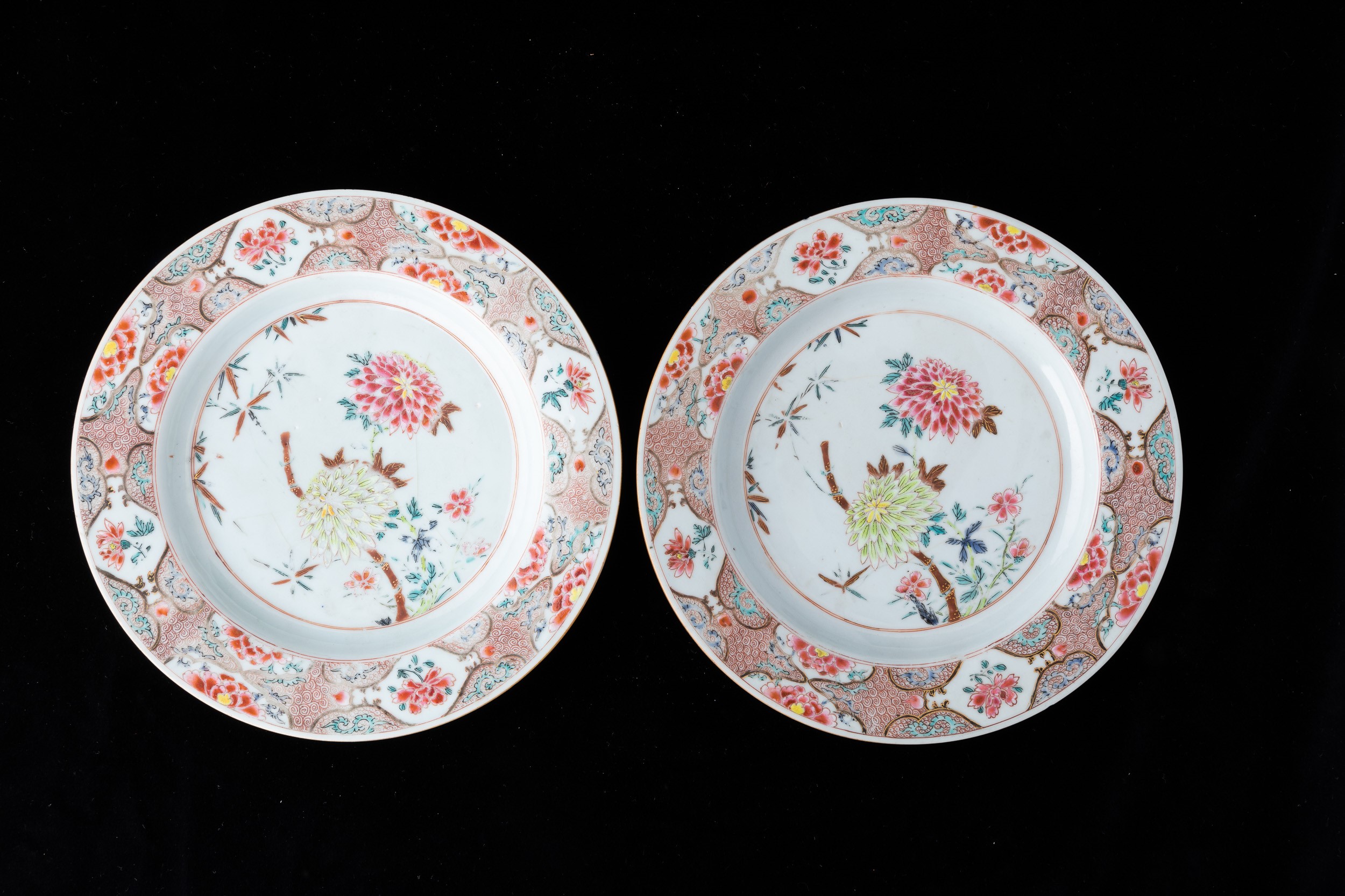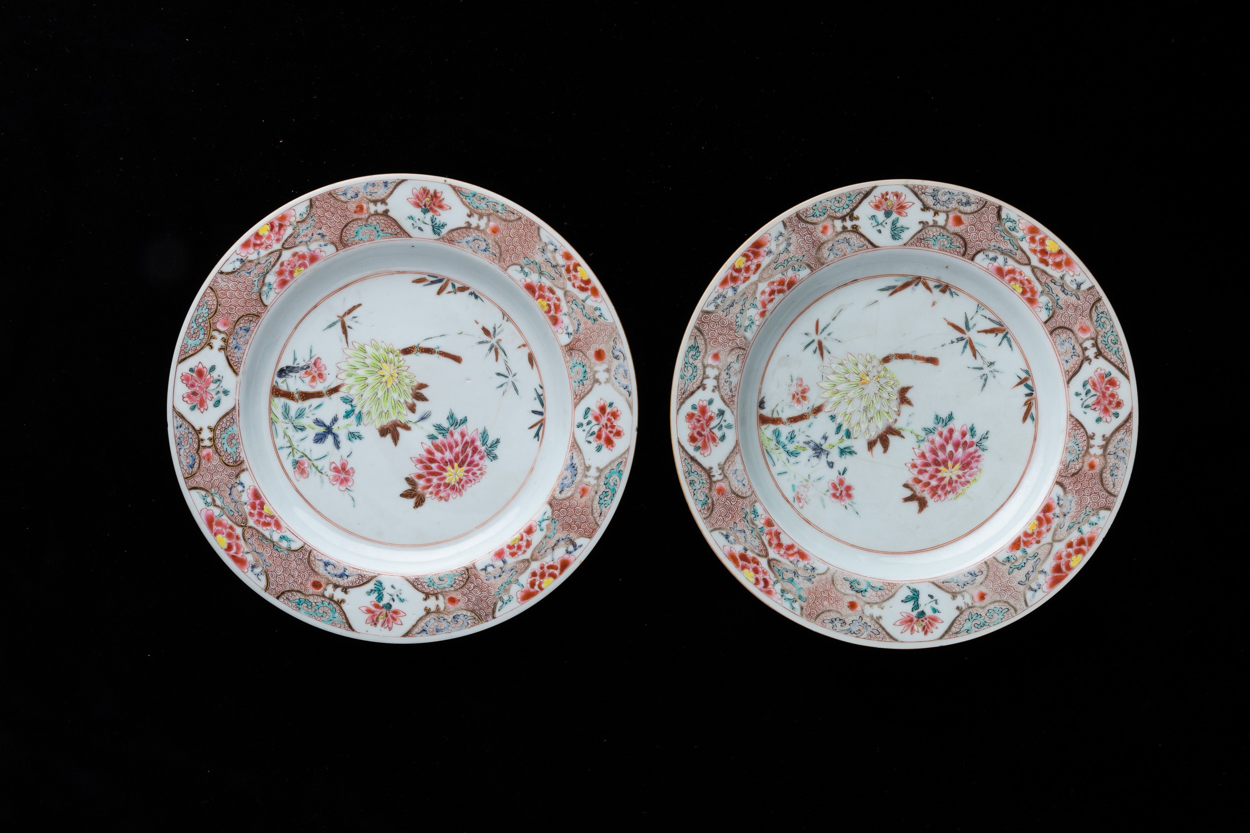 Coppia di piatti in porcellana a smalti policromi Famiglia Rosa con peonie e decori [..]