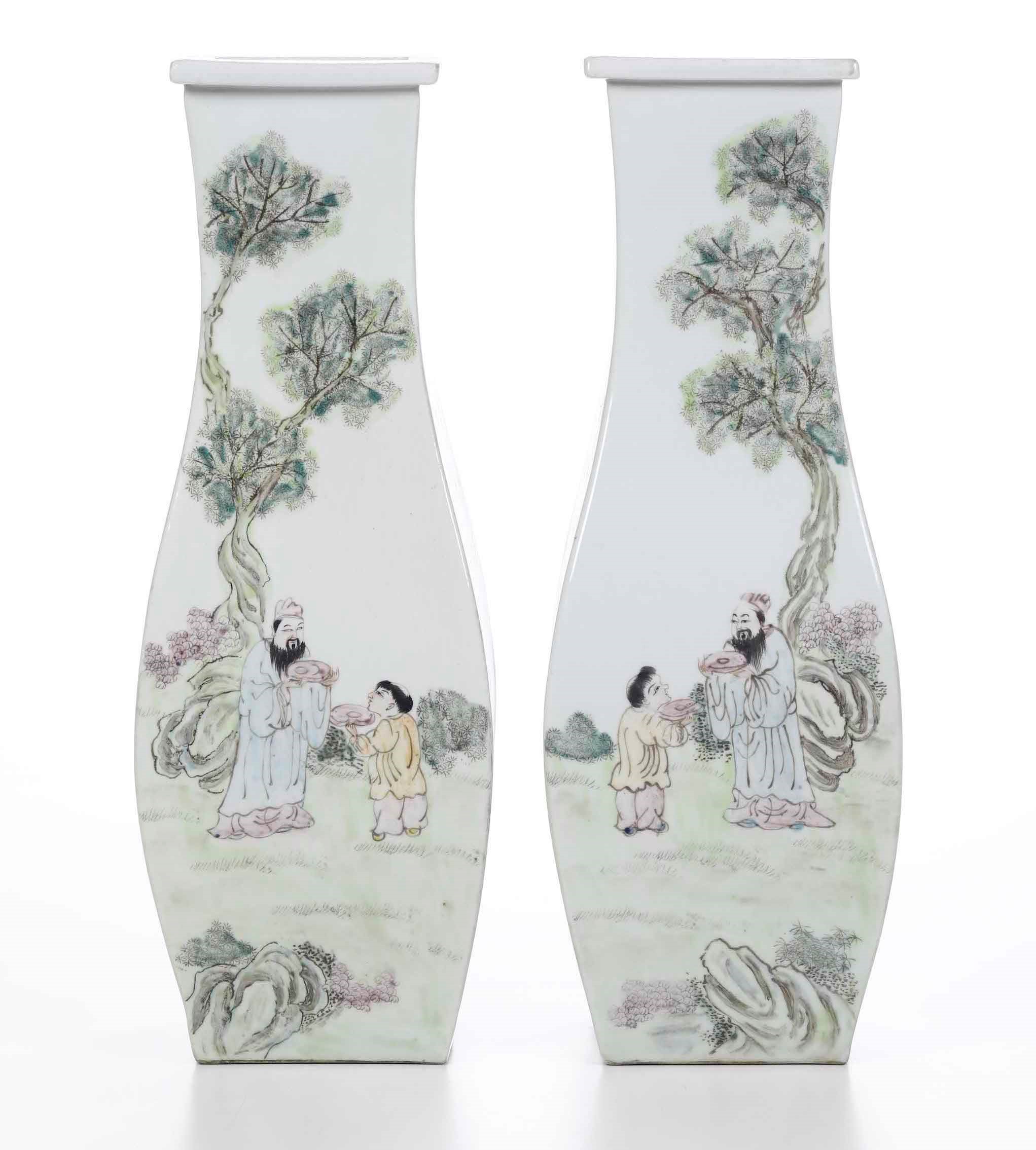 Coppia di vasi in porcellana con raffigurazione di saggi con discepoli entro paesaggio, [..]