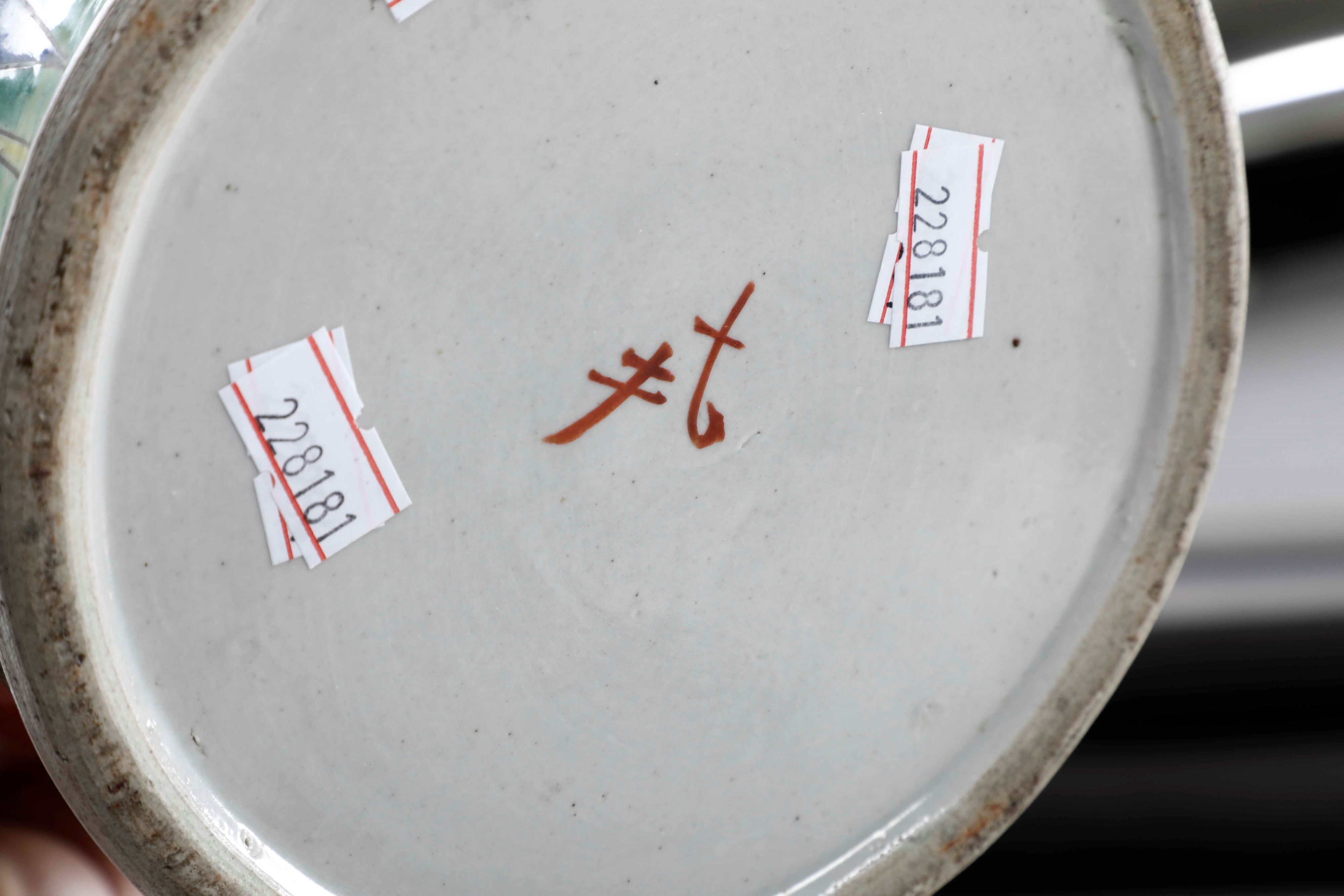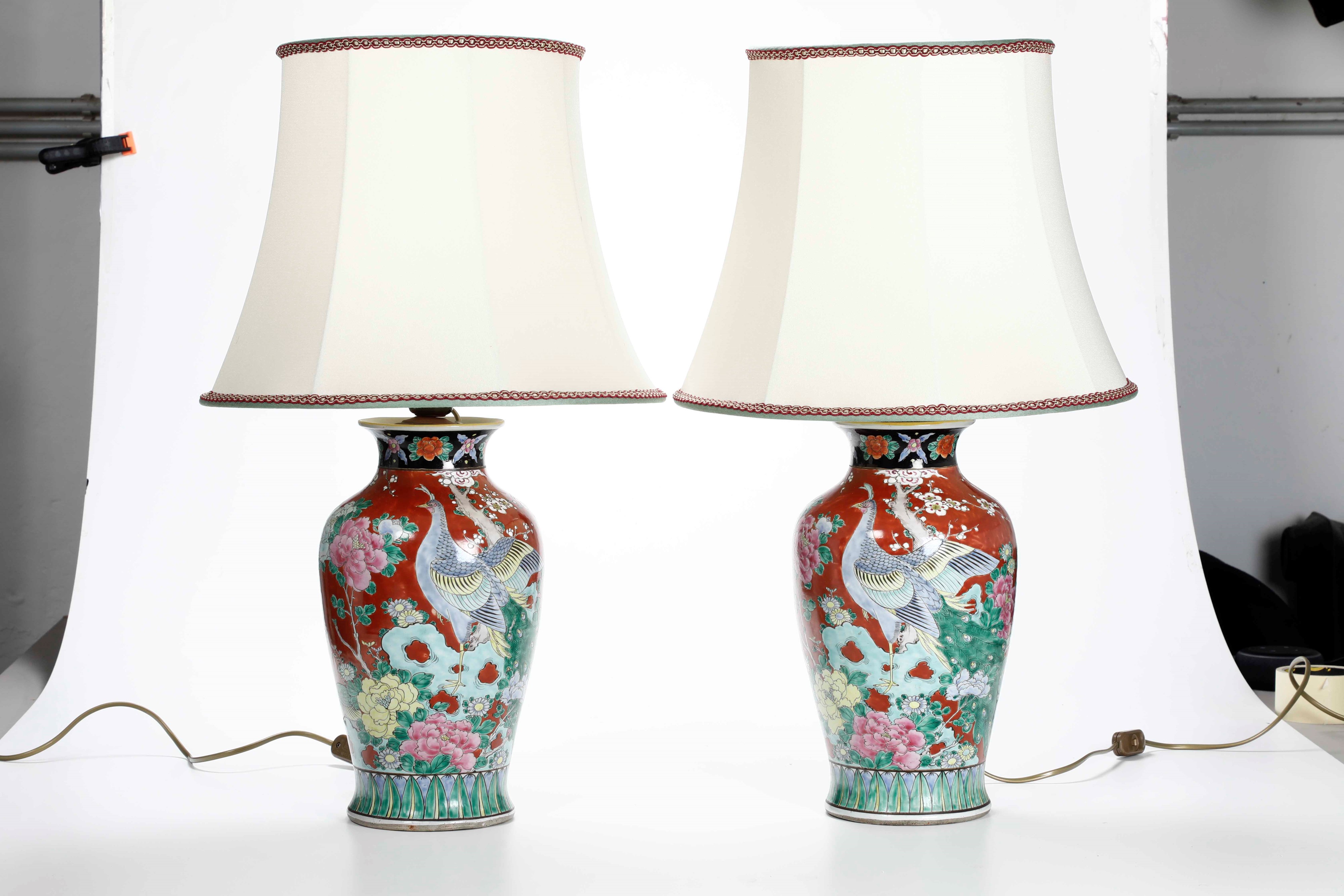 Coppia di vasi in porcellana raffiguranti fenici e peonie in fiore su fondo rosso, [..]